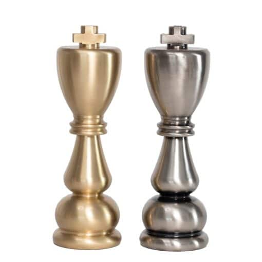 Uno de nuestros más bellos juegos de ajedrez de latón macizo, estilo Staunton, con un diseño revisado. Las piezas están esculpidas, cinceladas y pulidas a mano por un artesano italiano para el que la atención a los detalles es importante y uno sólo puede comprobarlo al ver estas magníficas piezas.