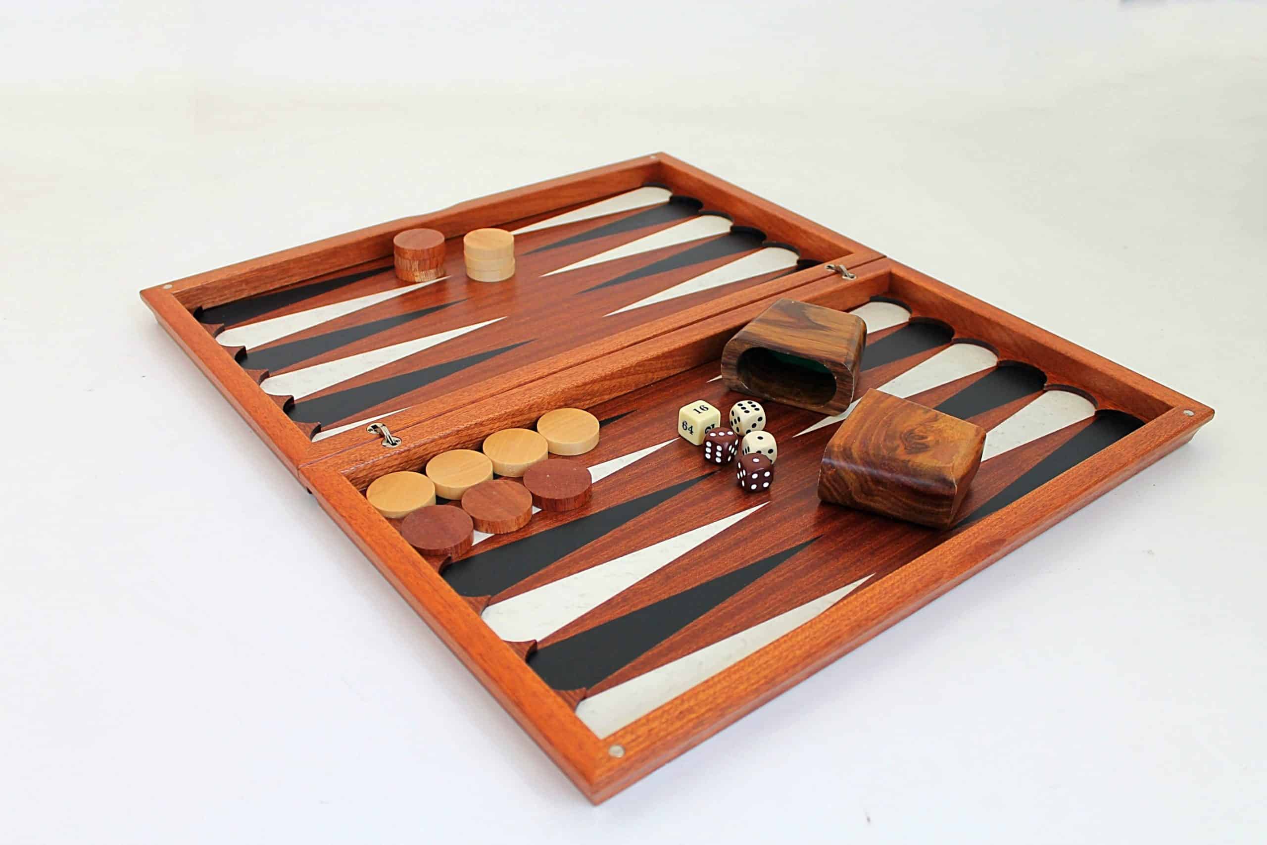 Fabricado completamente a mano por artesanos expertos en juegos de madera, está realizado en una hermosa madera de caoba. Las damas y los cubiletes también son de madera.