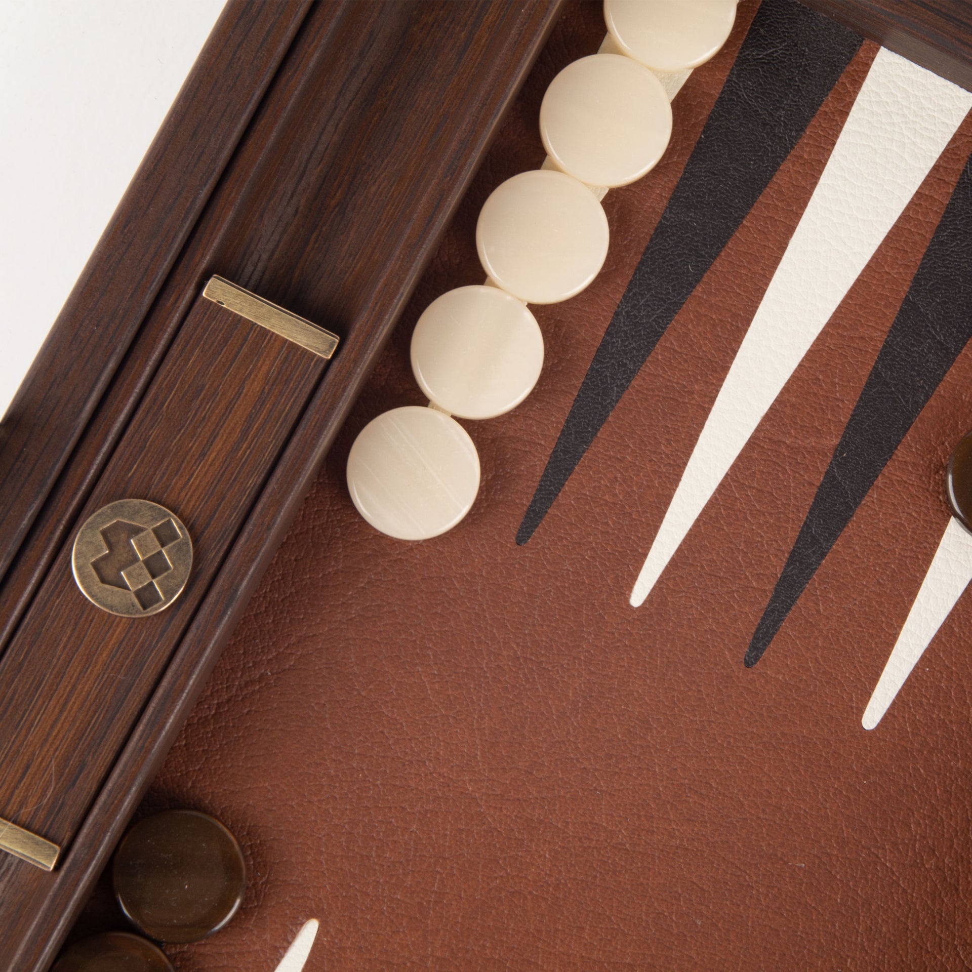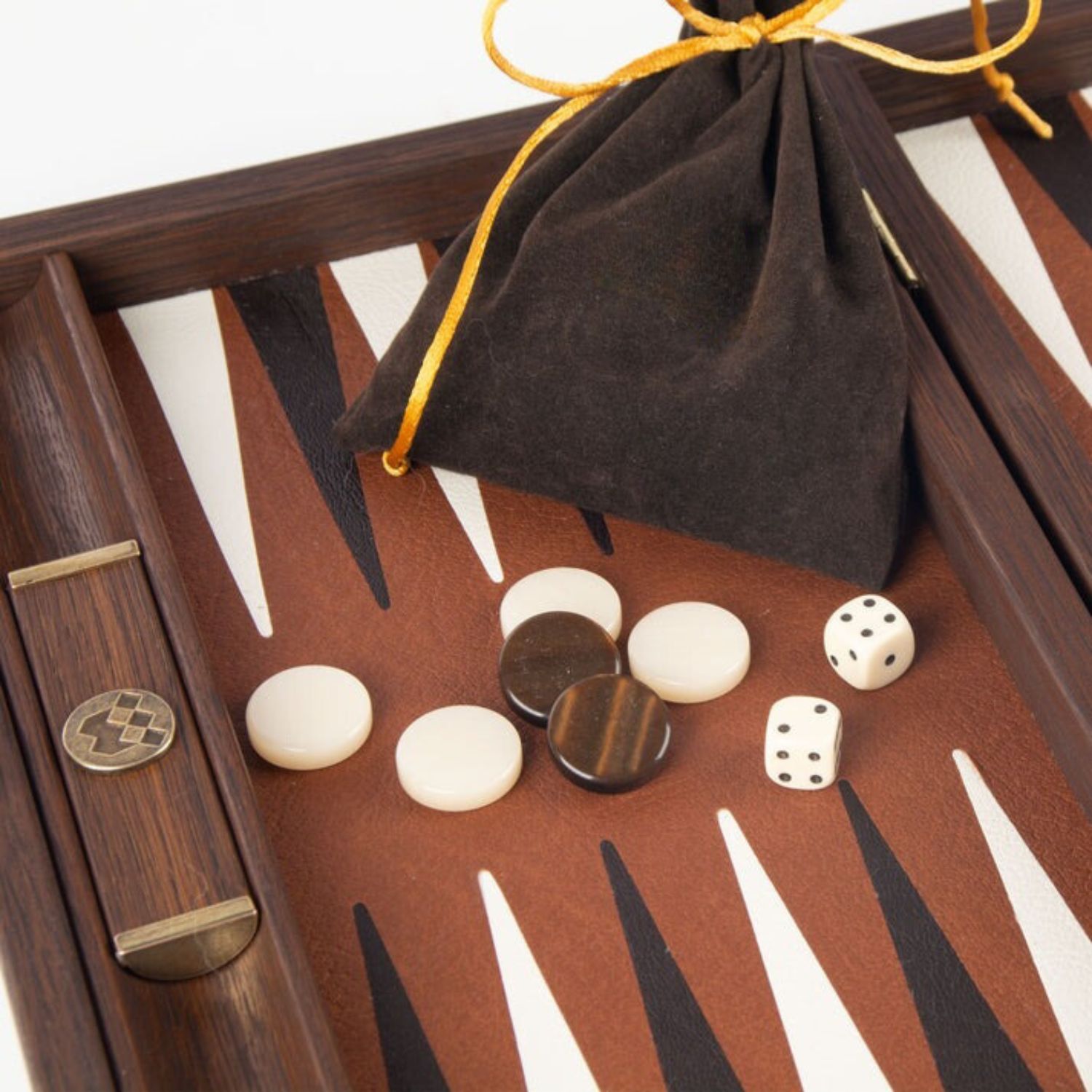 El set incluye 30 fichas de nácar (15 marrones y 15 blancas) que añaden un toque de lujo al juego, así como 4 dados, un dado vacío, y una pareja de copas para dados de madera, ofreciendo todo lo necesario para una partida de calidad.