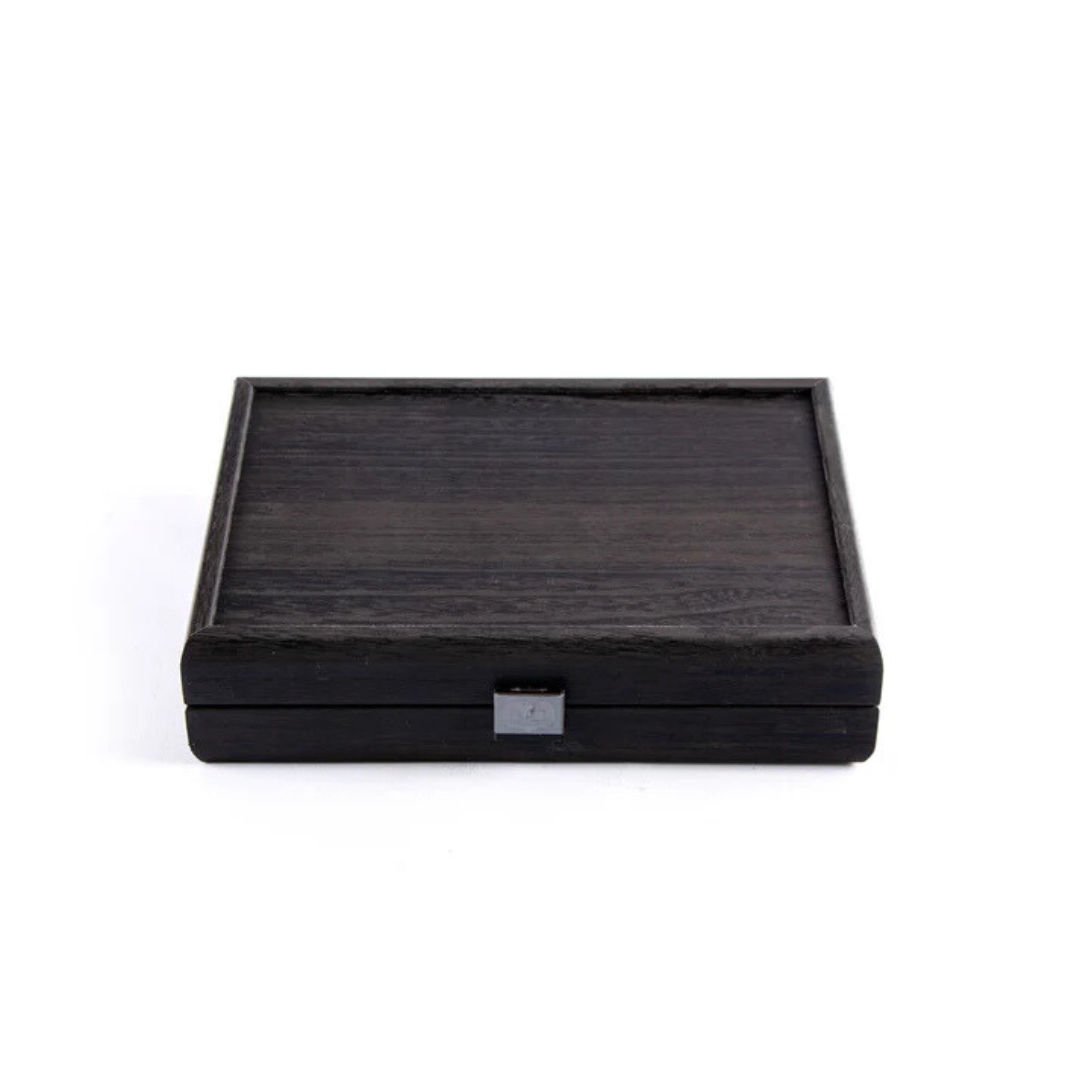 Descubre nuestro cofre de madera negra, de una dimensión de 24 x 17 cm, con dos juegos de cartas de plástico de alta gama, diseñado para una experiencia de juego excepcional.