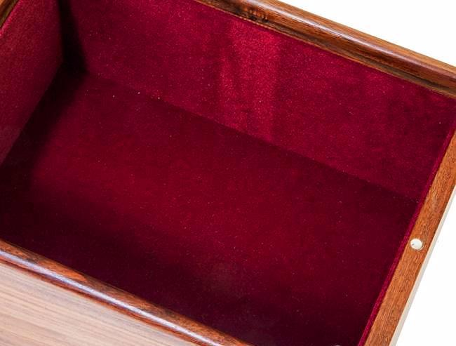 Dentro de la caja encontrará un gran compartimento de fieltro grueso, de color burdeos, para guardar sus piezas de ajedrez de forma segura.