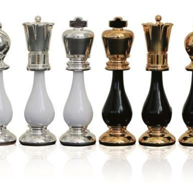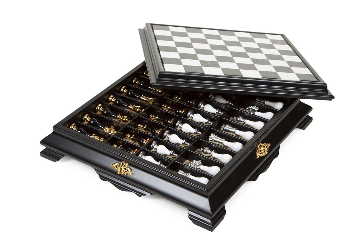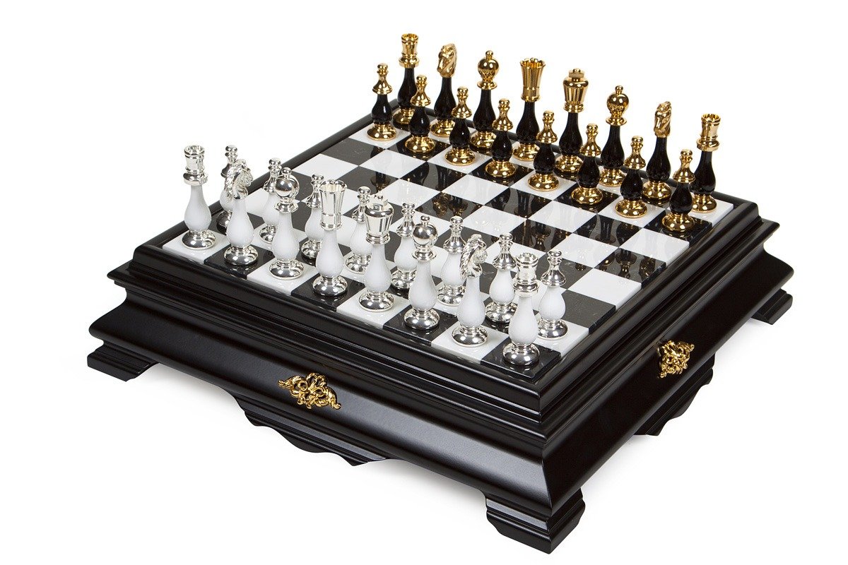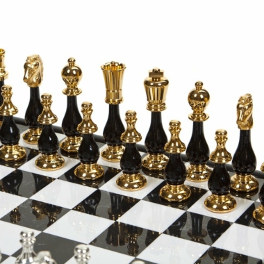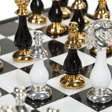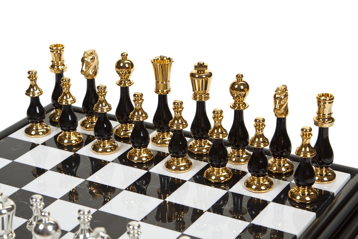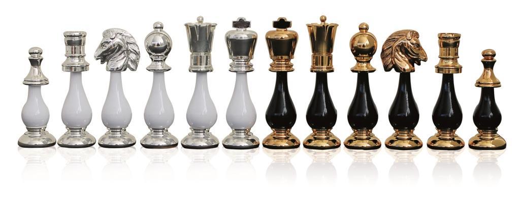 Las piezas de ajedrez negras y blancas están completamente esculpidas, pulidas y ponderadas a mano. Cuentan con un chapado en oro de 24 quilates y plateado.