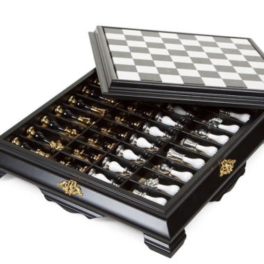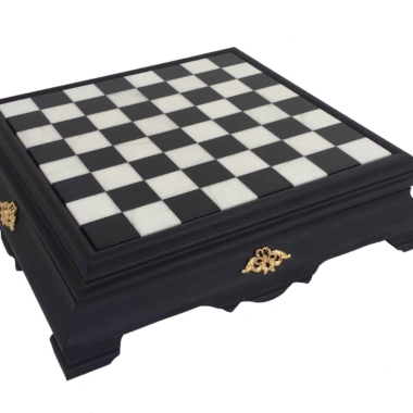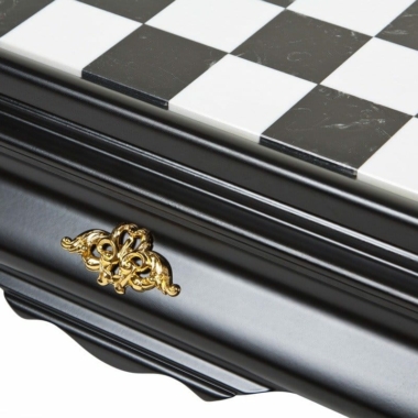 El tablero de ajedrez es de gran tamaño, está completamente realizado en madera, su tablero de juego en mármol de carrara negro y blanco completa perfectamente el conjunto.