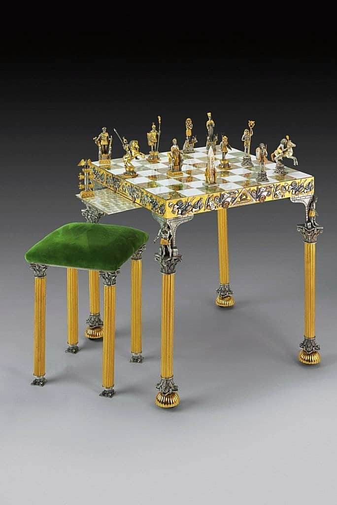 Esta mesa de jugador de ajedrez de prestigio y su juego de ajedrez, de gran tamaño, con un acabado perfecto, representan maravillosamente la idea del lujo.