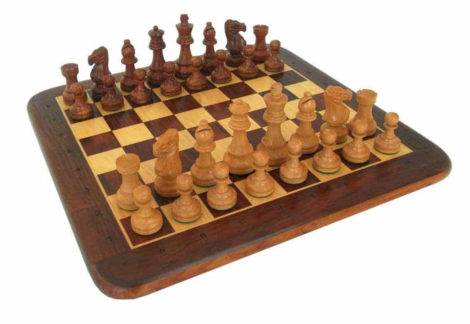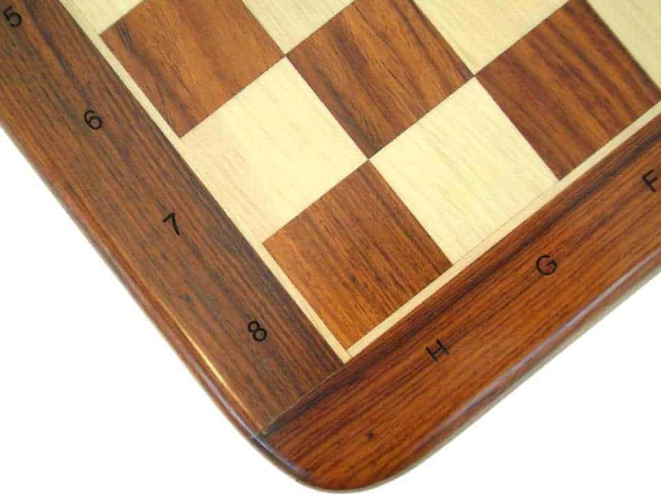 La particularidad del tablero que acompaña al conjunto de piezas es que dispone de marcadores alfanuméricos en el contorno de la superficie. El interés es facilitar la comunicación si desea localizar una pieza en particular a su oponente, o para discutir la partida en curso para aquellos que lo observan o incluso para practicar con libros de ejercicios. Está hecho a mano, en madera de rosa dorada y arce.