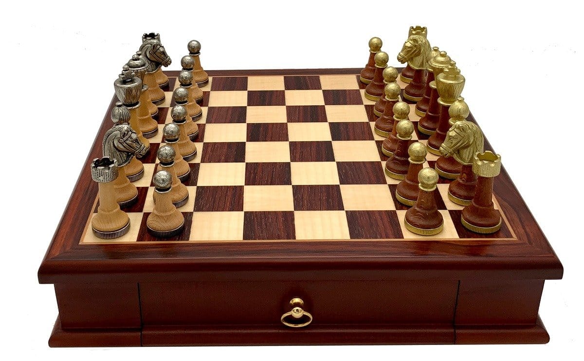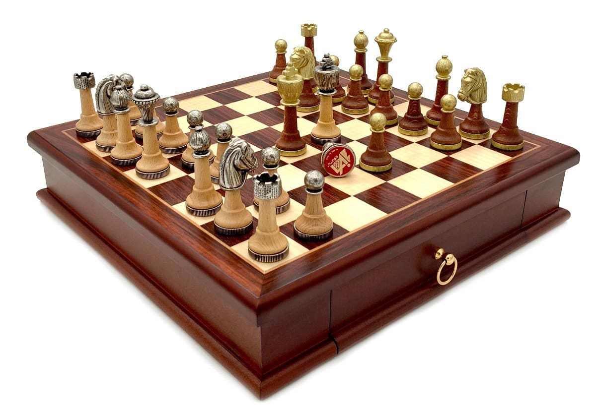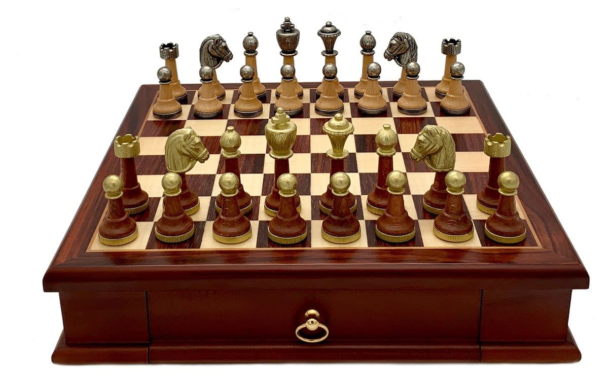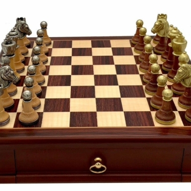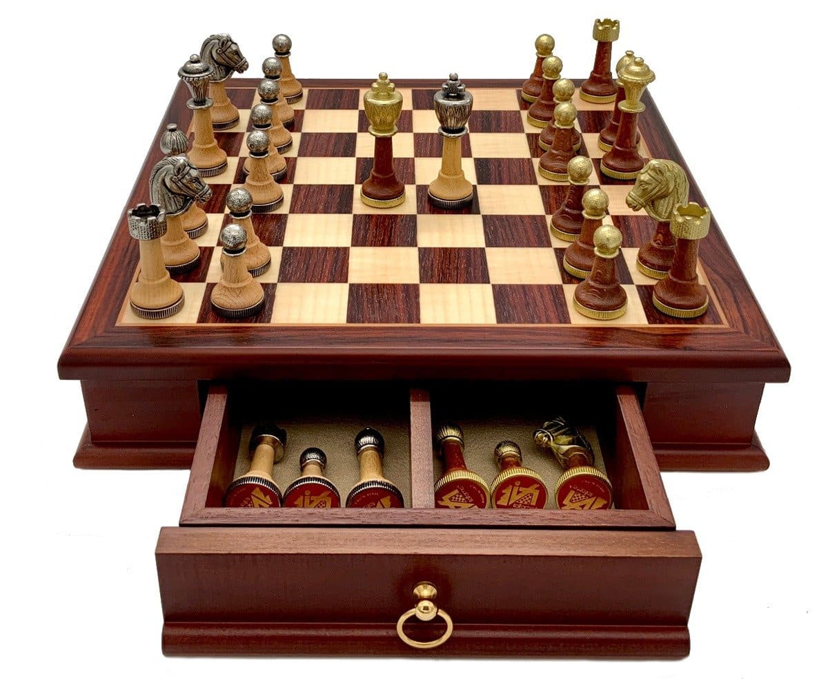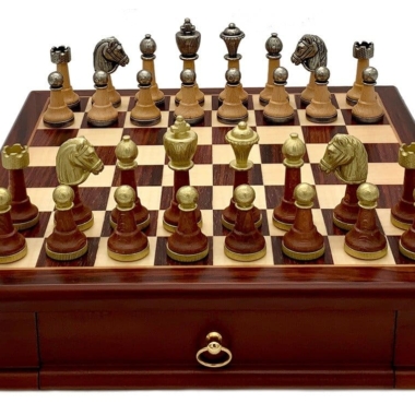 El set de juego de ajedrez es clásico, de estilo Staunton, realizado en madera y metal macizo. El conjunto está esculpido y cincelado a mano, note al hacer zoom en la foto los filigranas que adornan la parte superior de las piezas, un trabajo artesanal de alta calidad!