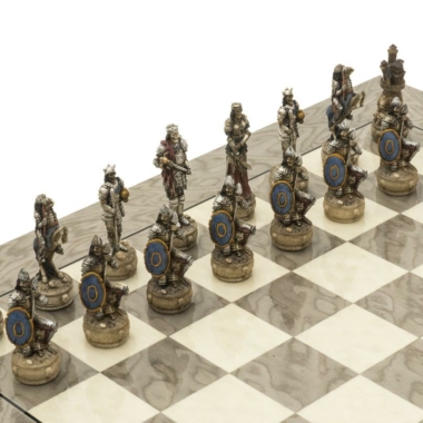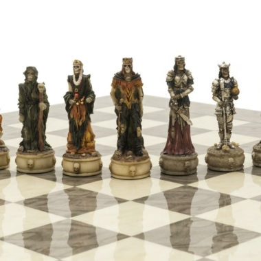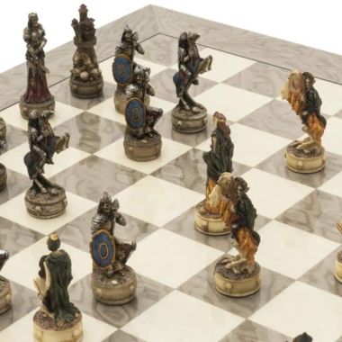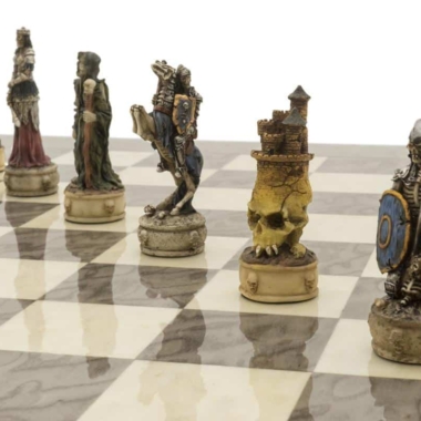 ¡Un magnífico juego de ajedrez con un tema de dark fantasy que enfrenta a dos feroces ejércitos de no-muertos en un conflicto eterno! Un batallón de temibles guerreros esqueletos se enfrenta a un regimiento de zombis. La altura del rey es de 8,2 cm.