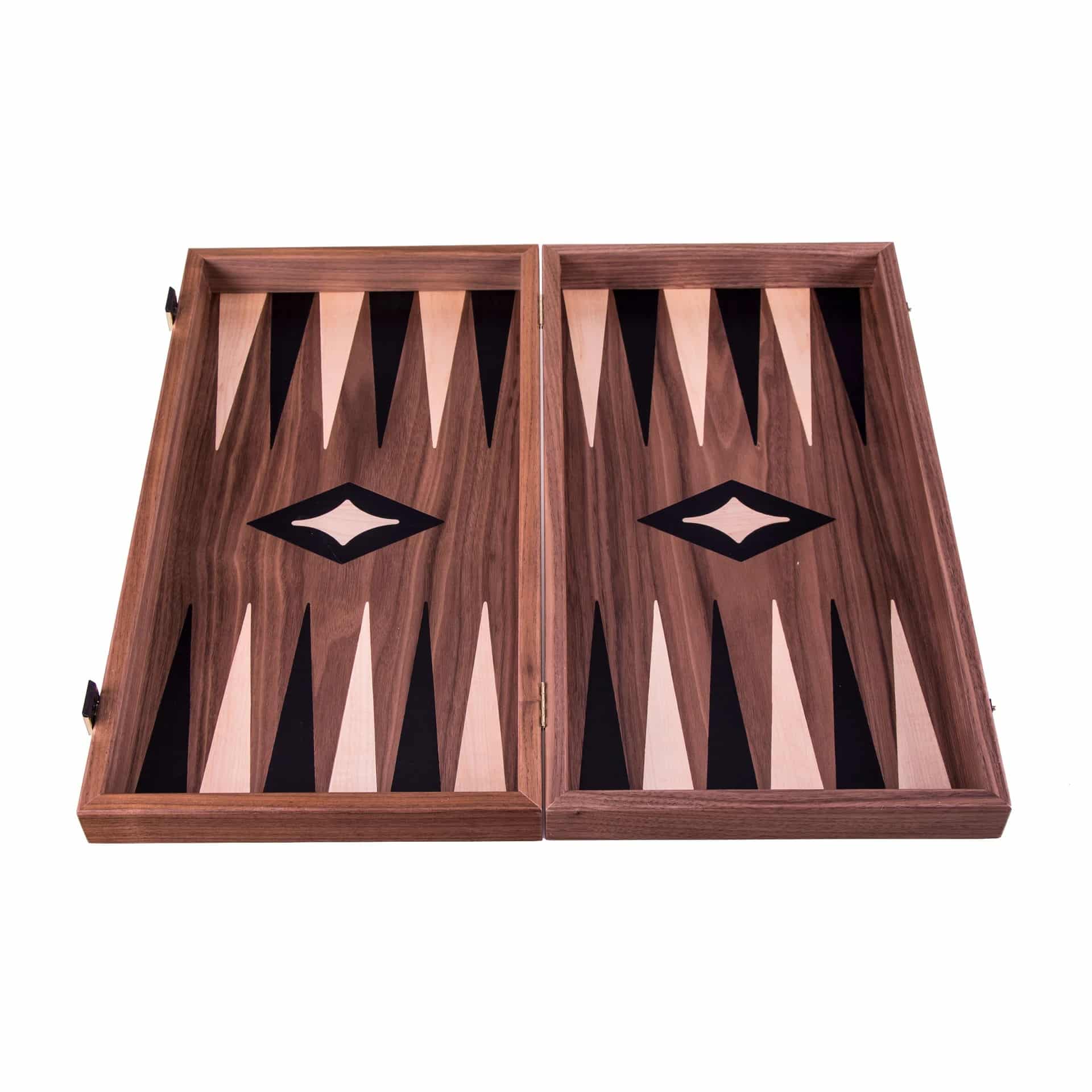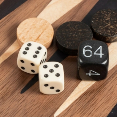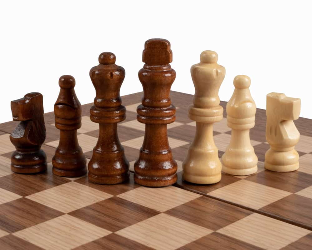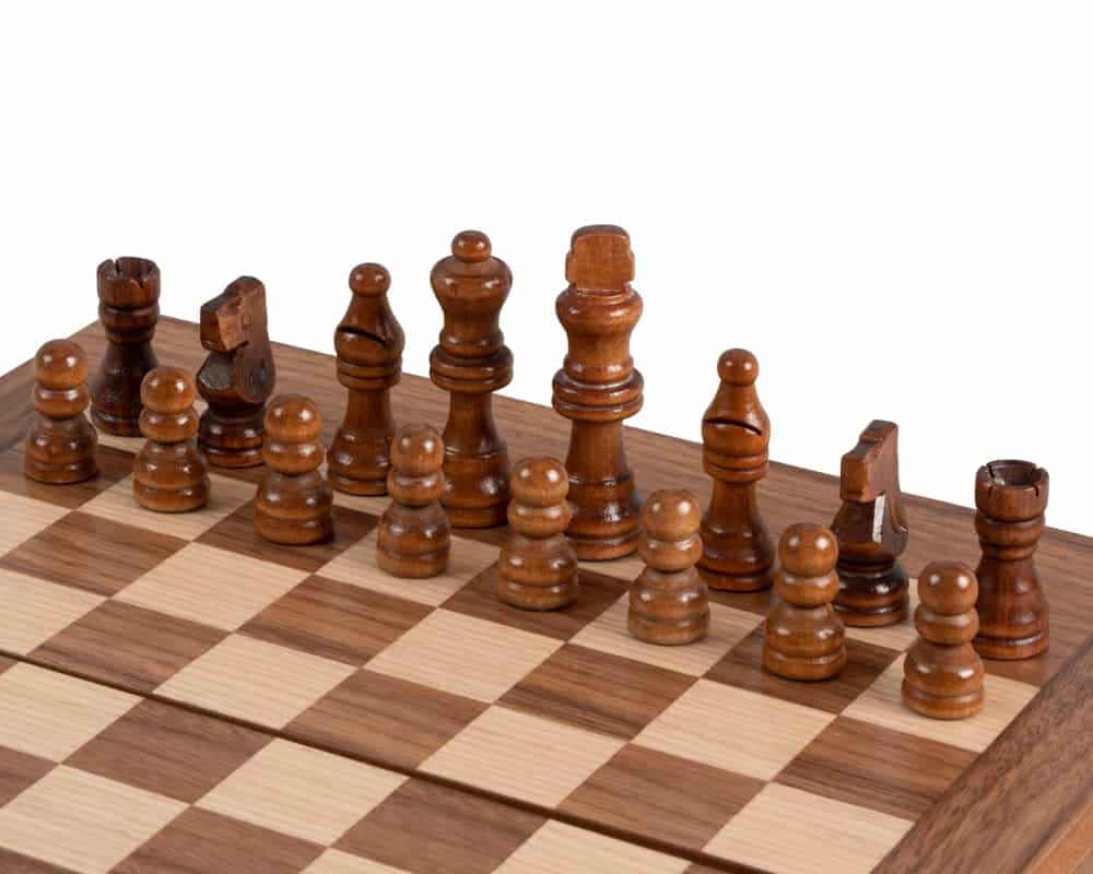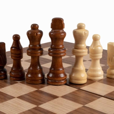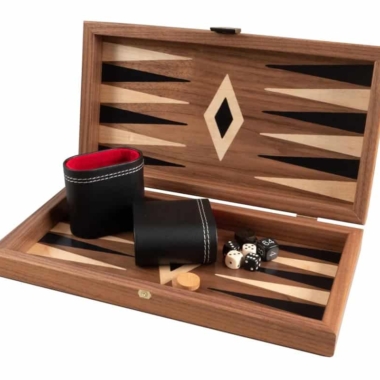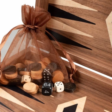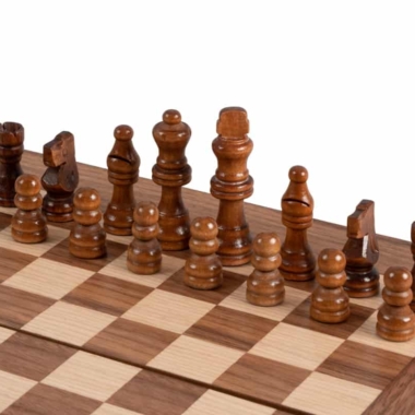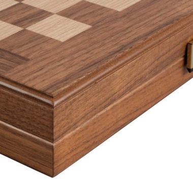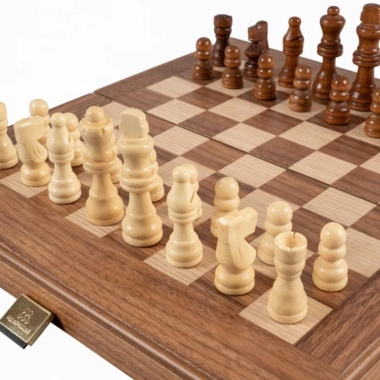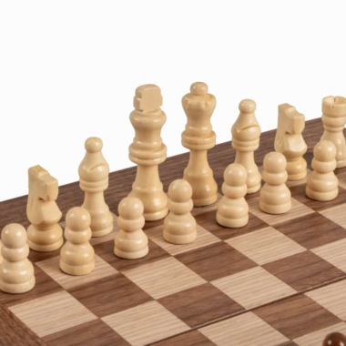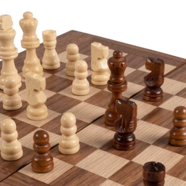 Las piezas de ajedrez de madera y los peones de damas de plástico efecto perla están incluidos. El tablero combina el nogal con puntas de roble negro, creando un contraste refinado y armonioso.