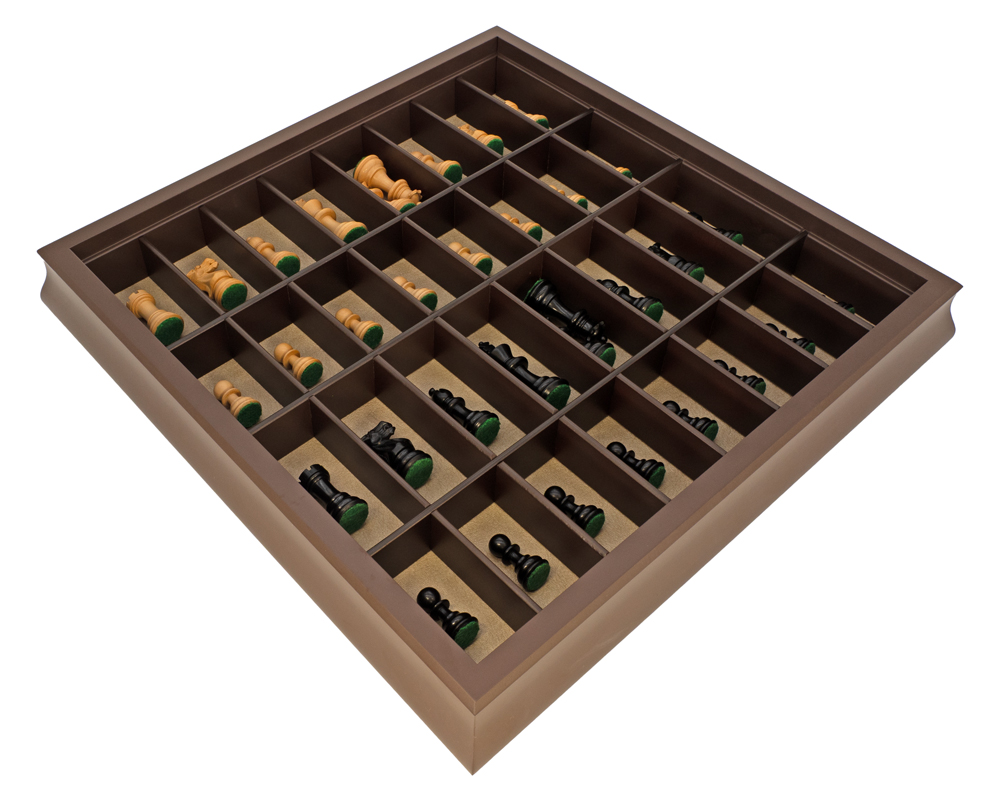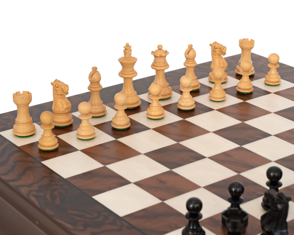 Este conjunto de piezas de ajedrez se acompaña de un hermoso tablero de 43 x 43 cm realizado en madera de nogal y arce. Se distingue por su acabado satinado, sus molduras marrón oscuro y su parte inferior forrada que protege sus superficies. Su caja de almacenamiento, dotada de una tapa extraíble y de compartimentos interiores, permite guardar cada pieza con elegancia y seguridad.