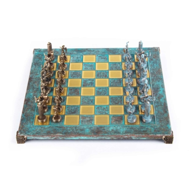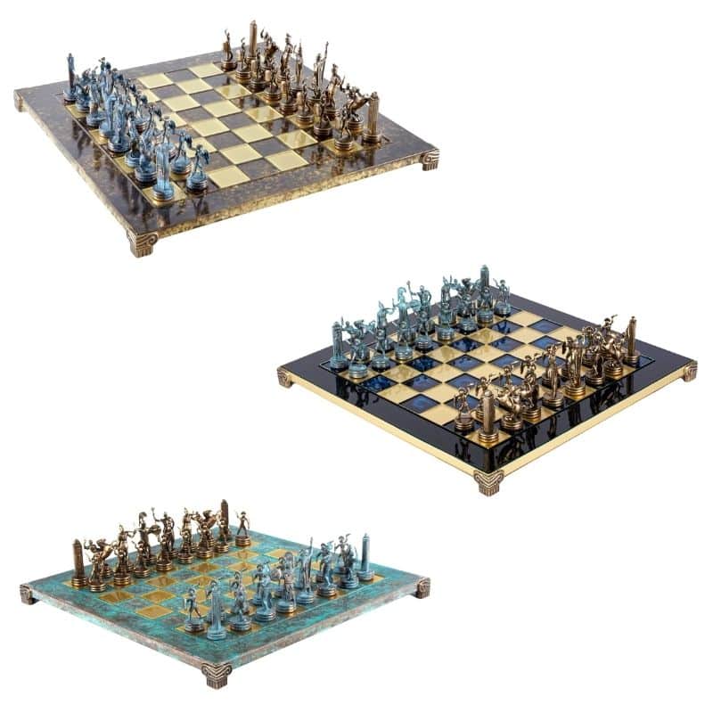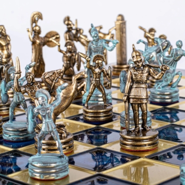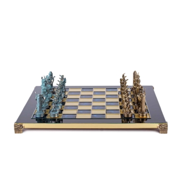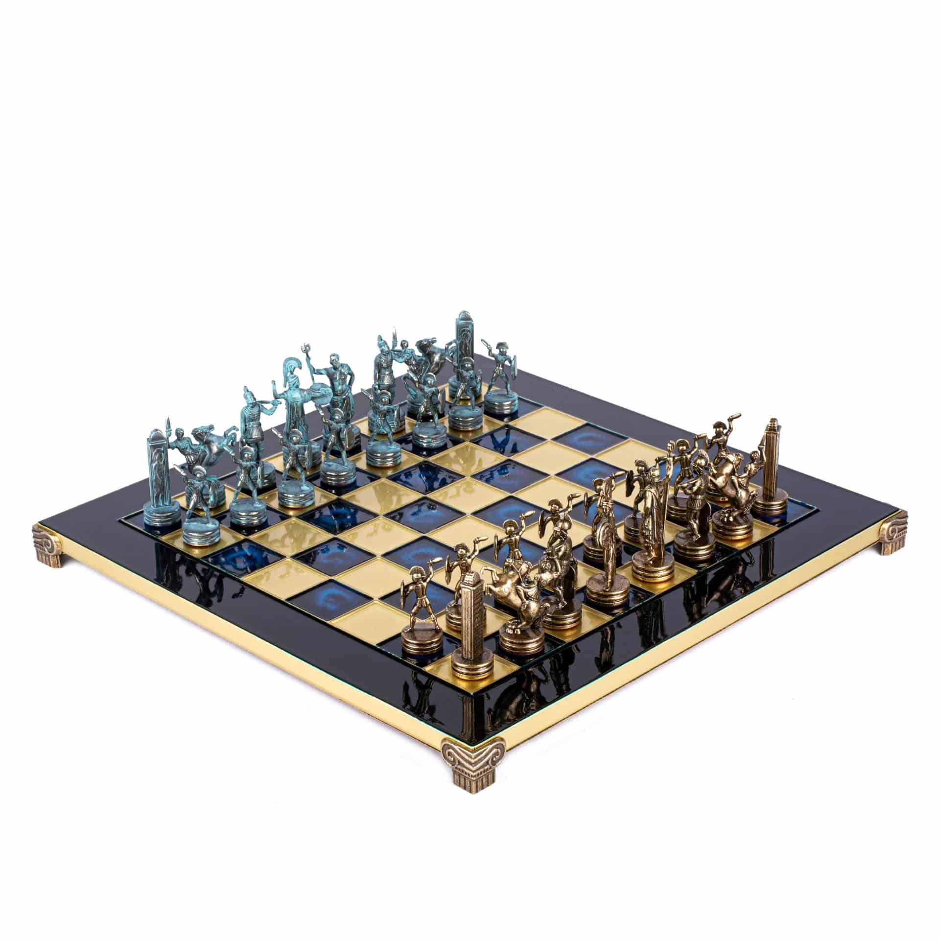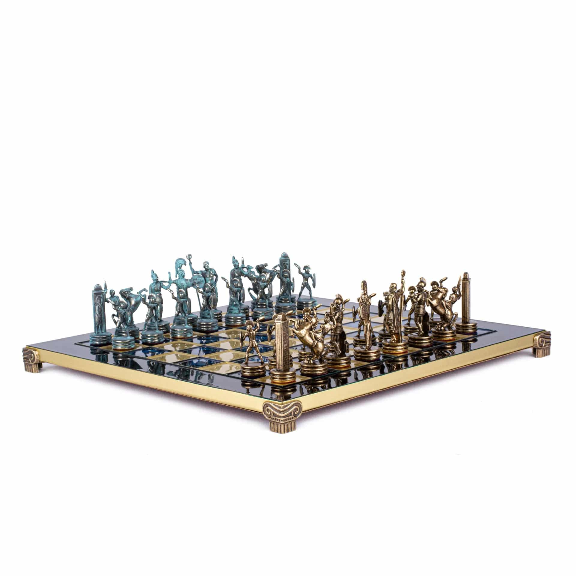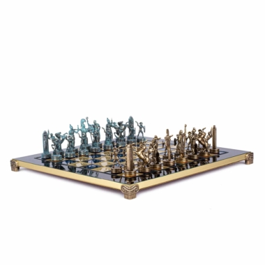 Conjunto de Ajedrez Mitología Griega en Metal – Piezas de Bronce y Azul con Tablero de Metal