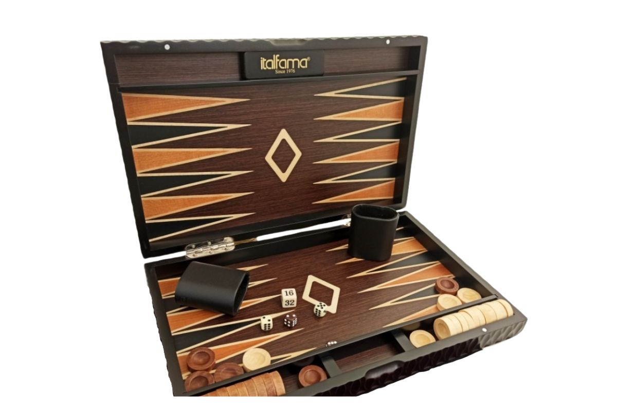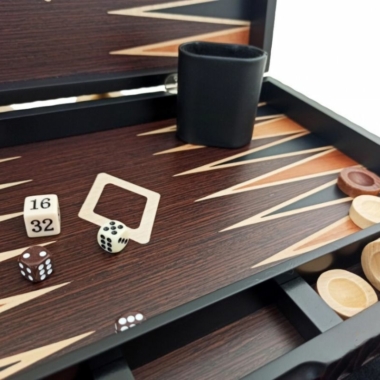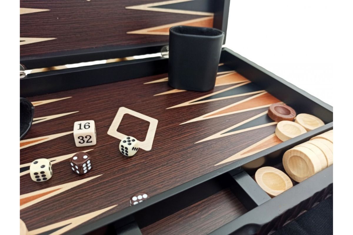El conjunto plegable viene con todos los accesorios necesarios para una partida completa de Backgammon: 30 fichas, 4 dados, 1 dado vacío y 2 copas para dados.
