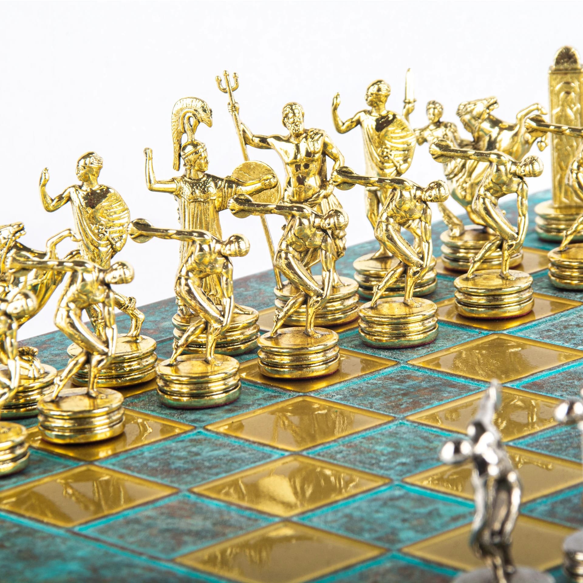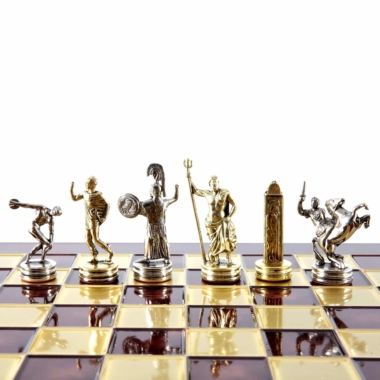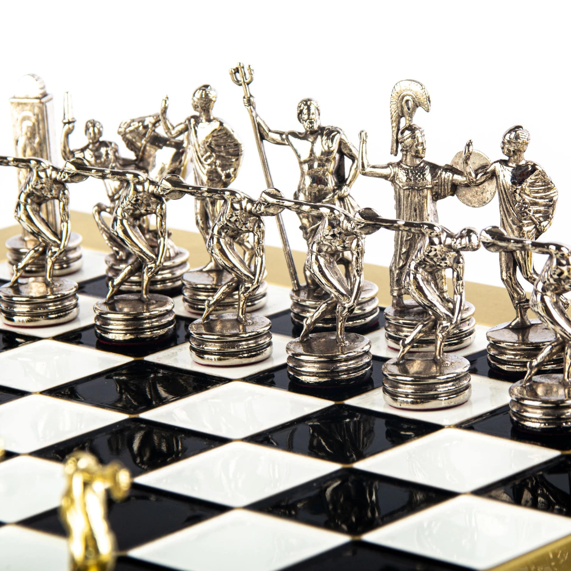 Descubre la elegancia de este conjunto de juego de ajedrez inspirado en los lanzadores de disco. Diseñado para los amantes de los juegos de ajedrez y los coleccionistas, este conjunto magnifica cada partida con piezas en metal plateado y dorado, que representan a los lanzadores de disco, símbolos de fuerza y precisión. Tienen una altura de rey de 6,5 cm.