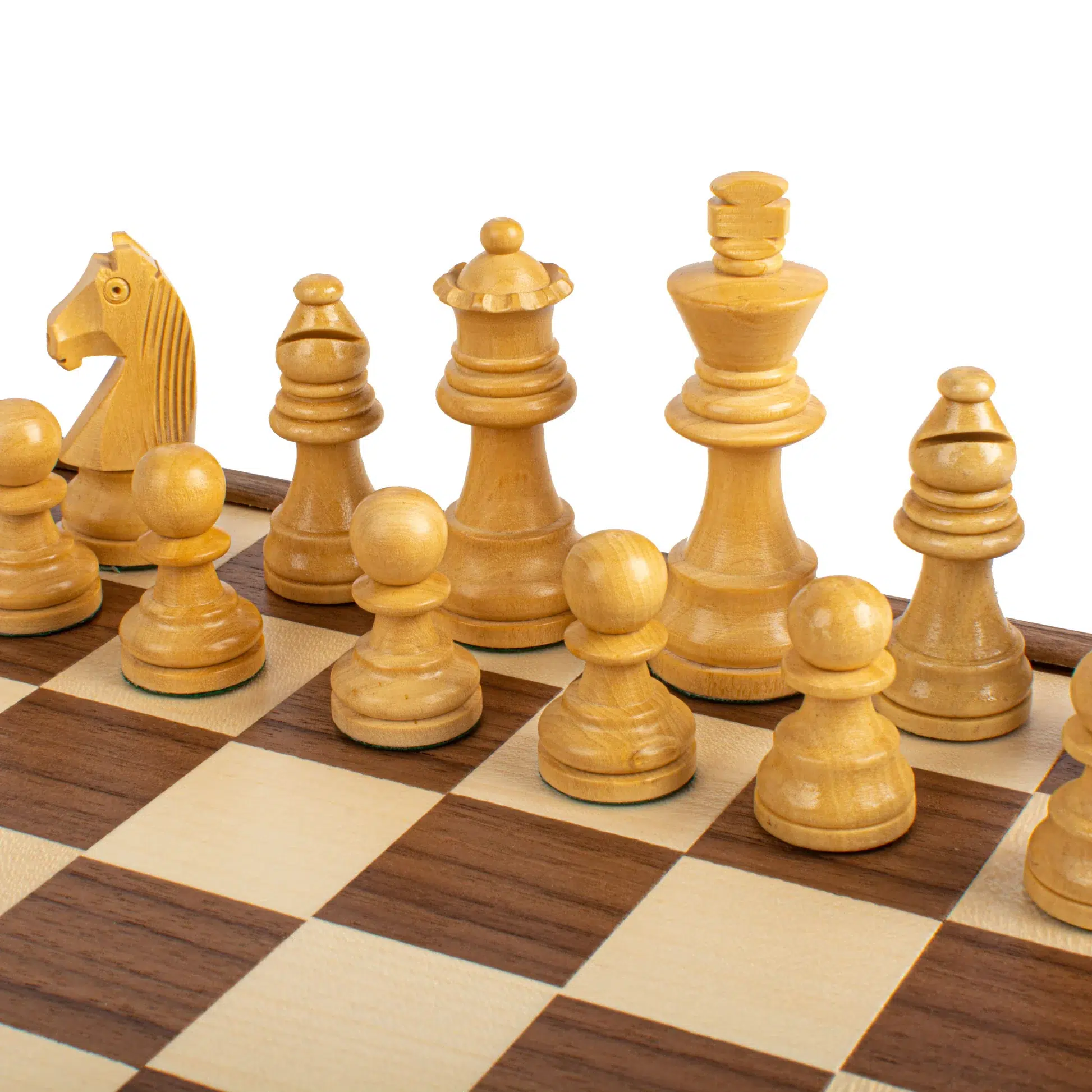 Este set incluye un tablero de ajedrez con almacenamiento de 27 x 27 cm, magníficamente diseñado en madera de nogal y roble, con casillas de 3 x 3 cm que ofrecen una superficie lisa y refinada.