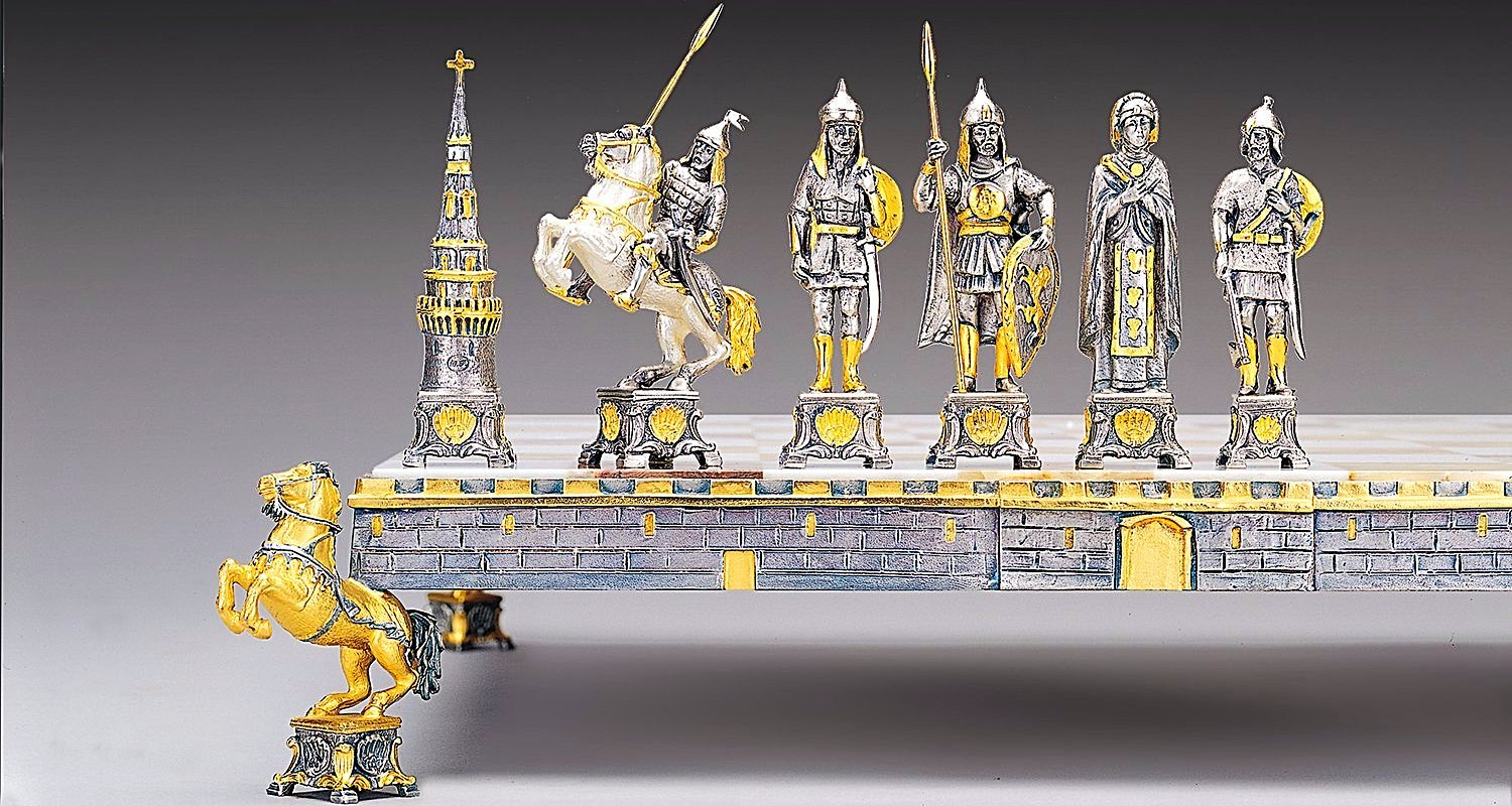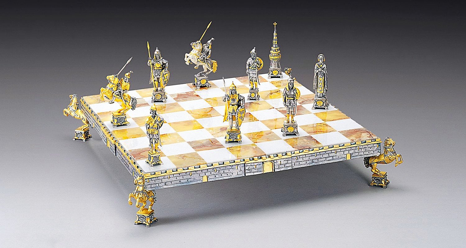 Acabado : Oro de 24 quilates. Las patas del tablero de ajedrez están realizadas en escultura en forma de caballos mirando al cielo sobre un pedestal.