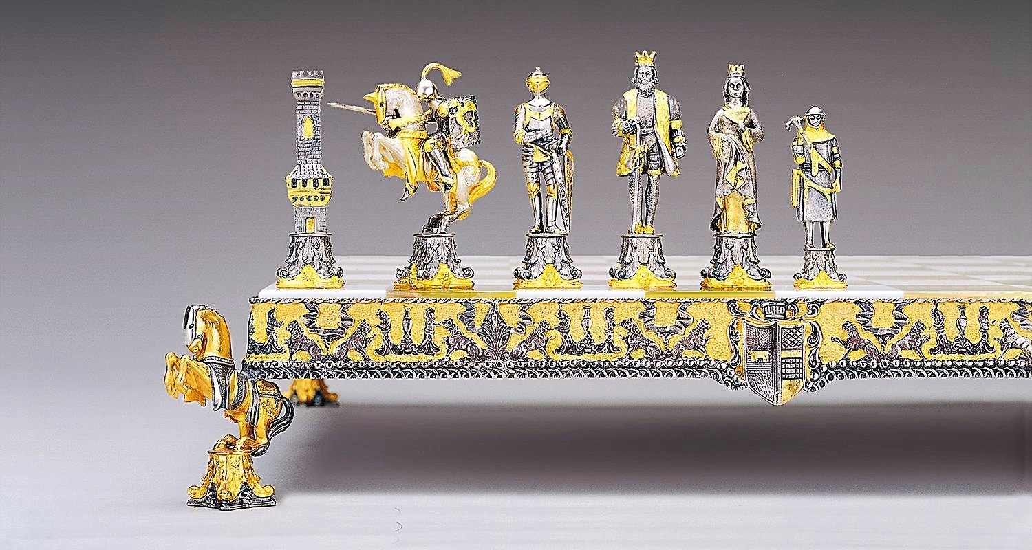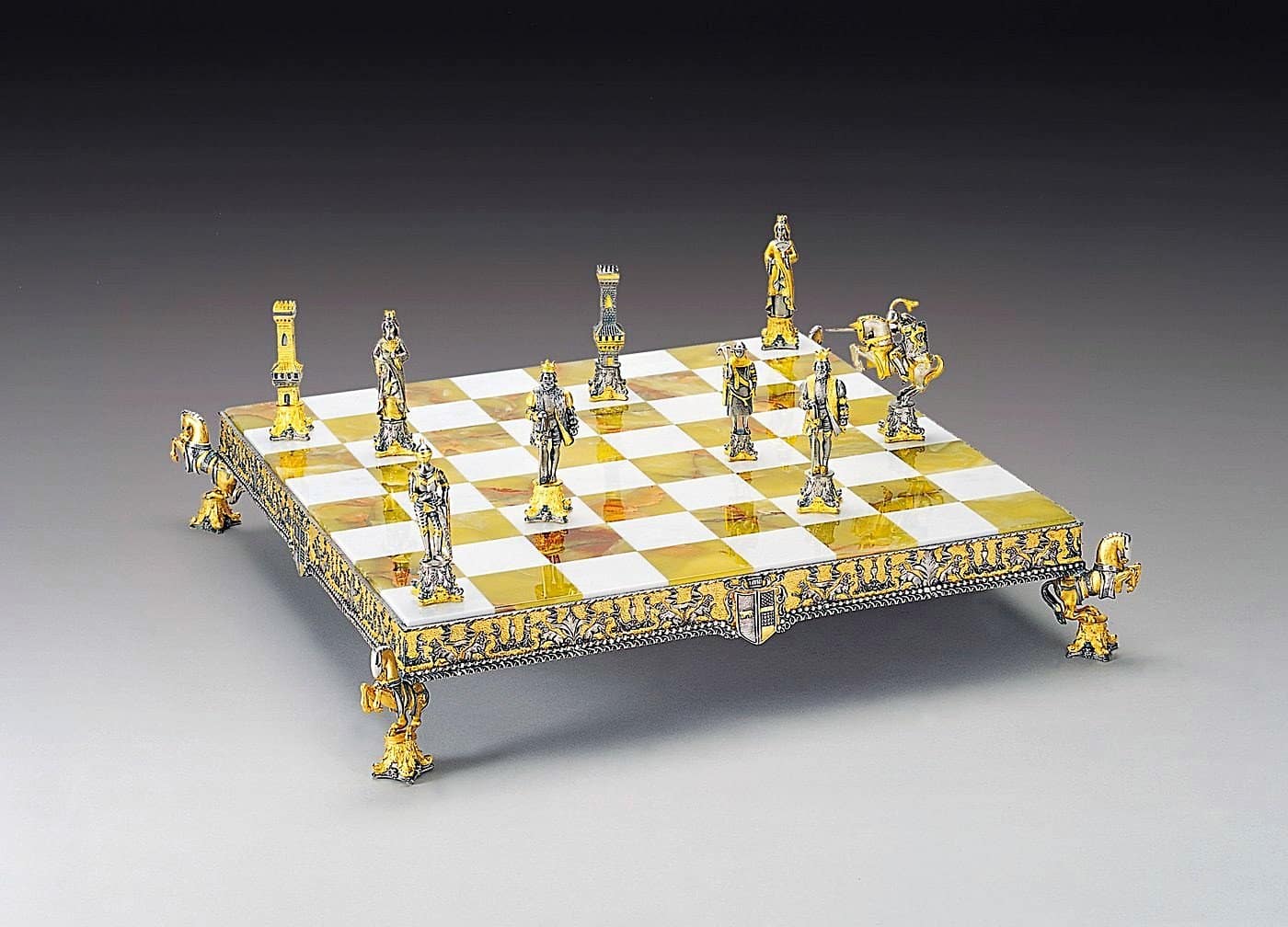 Acabado : Oro de 24 quilates. Las patas del tablero están realizadas en escultura en forma de caballos.