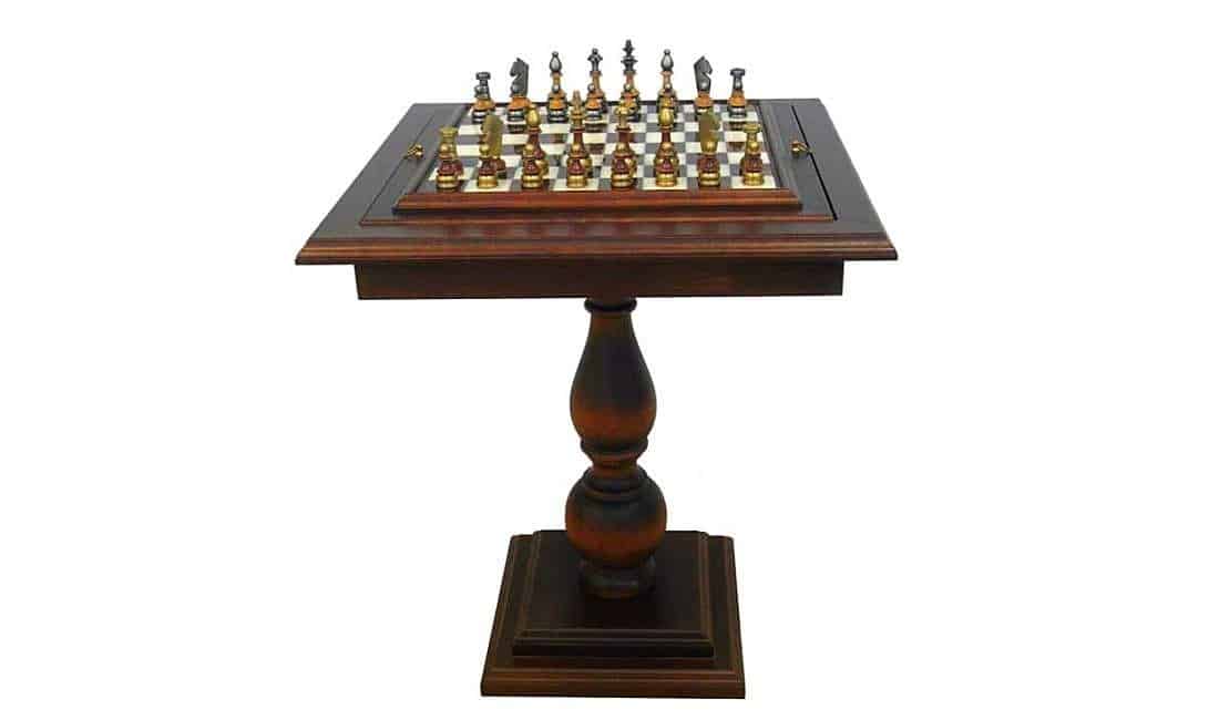 Una mesa de ajedrez de buena calidad que combina varios materiales, elegidos con cuidado, y un trabajo de escultura detallado asociado a un juego de ajedrez original y moderno.
