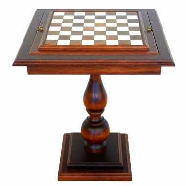 La mesa de ajedrez, cuadrada, con una pata, su soporte y el borde del tablero están esculpidos en madera de haya maciza. El tablero de juego está realizado combinando mármol de Carrara y alabastro de Toscana.