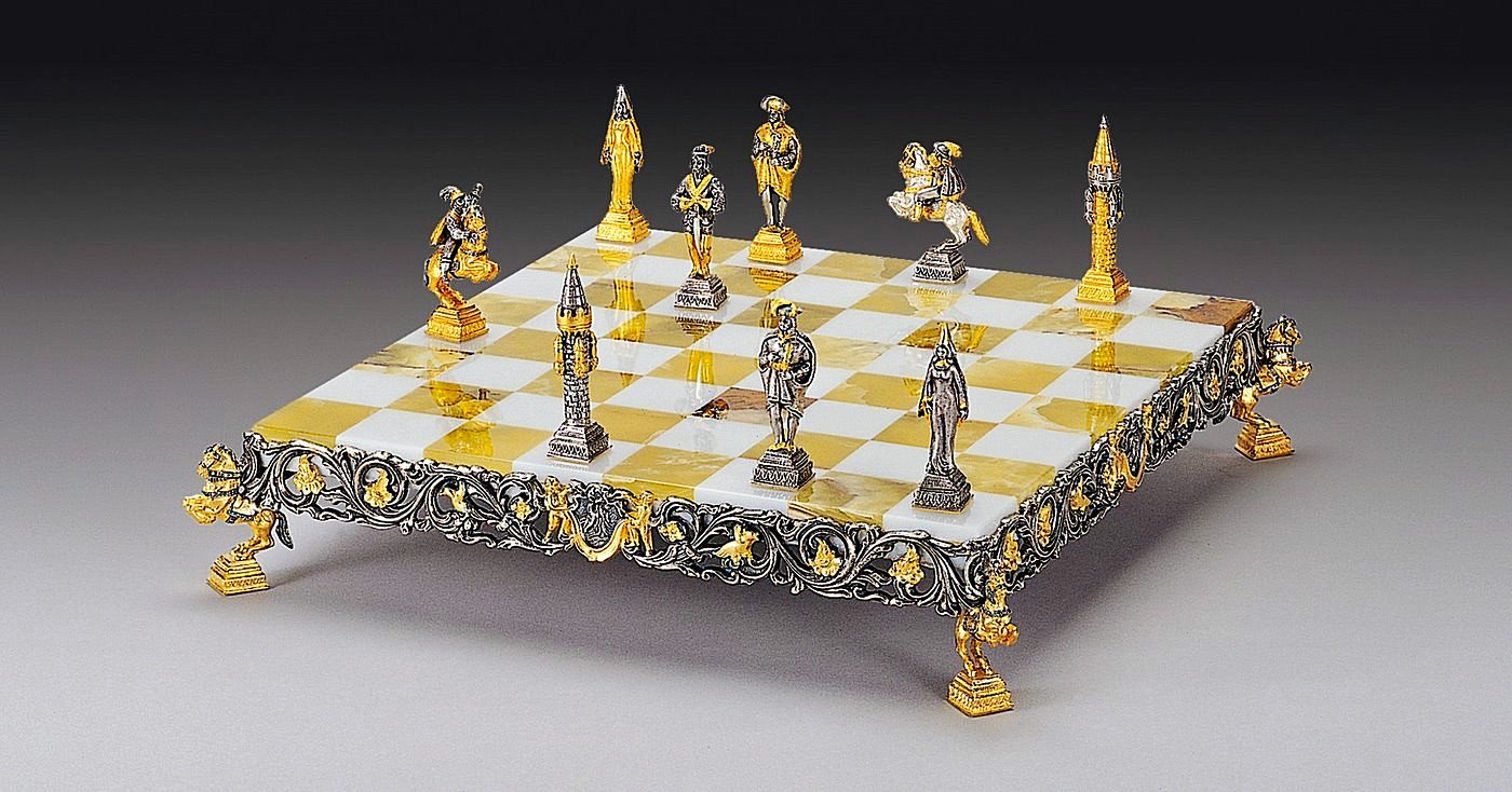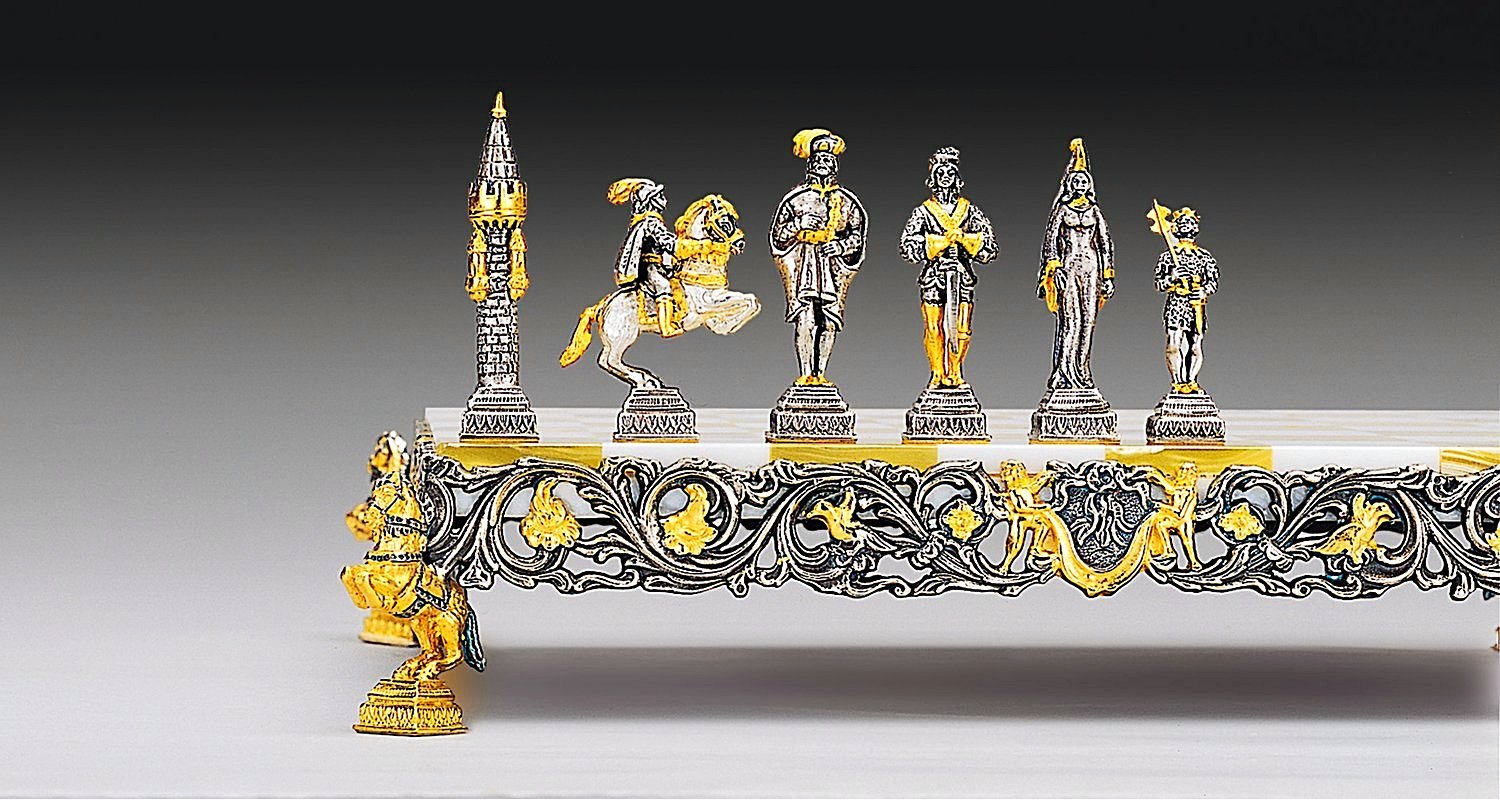 Acabado : Oro de 24 quilates. Las patas del tablero están realizadas en escultura en forma de pequeños caballos.