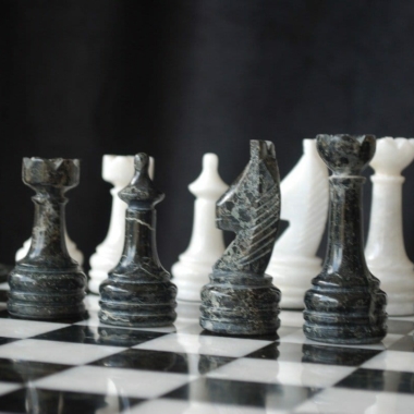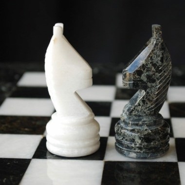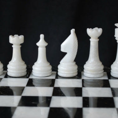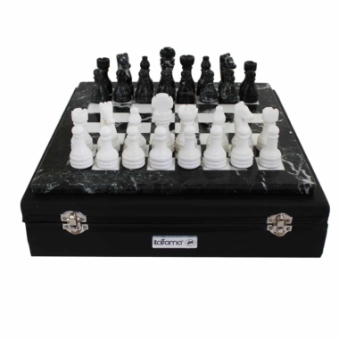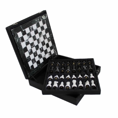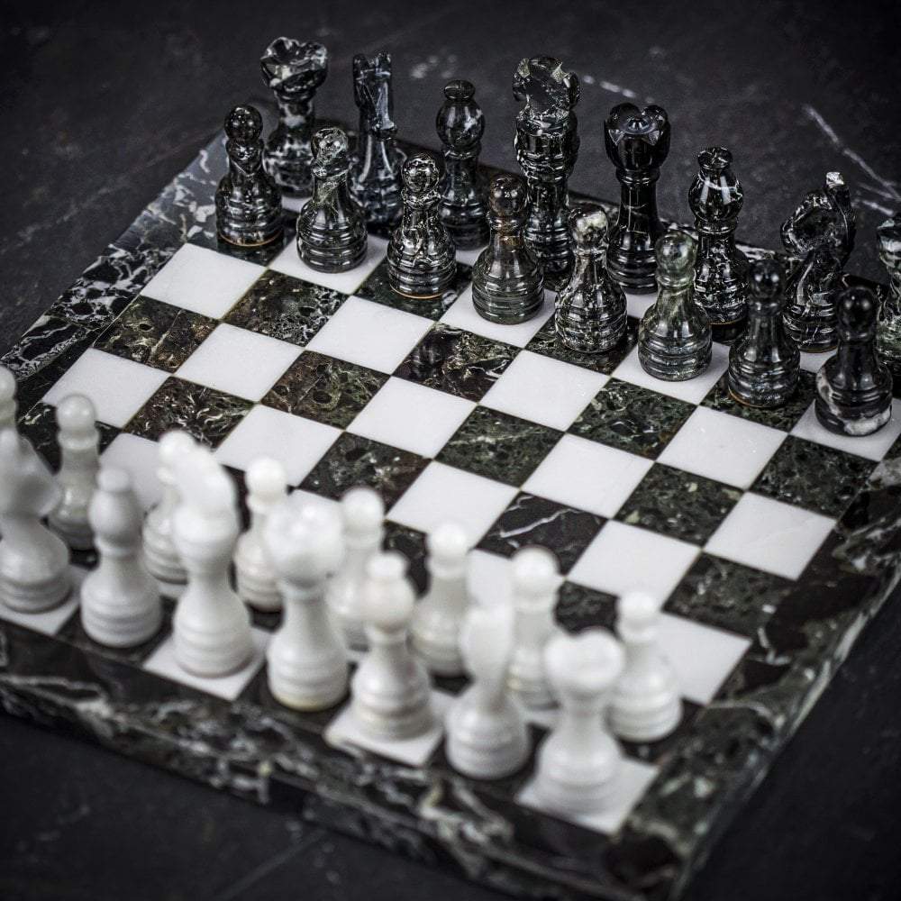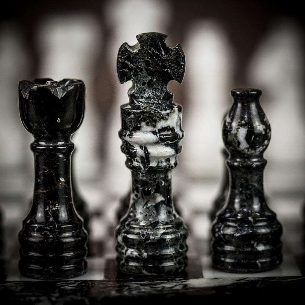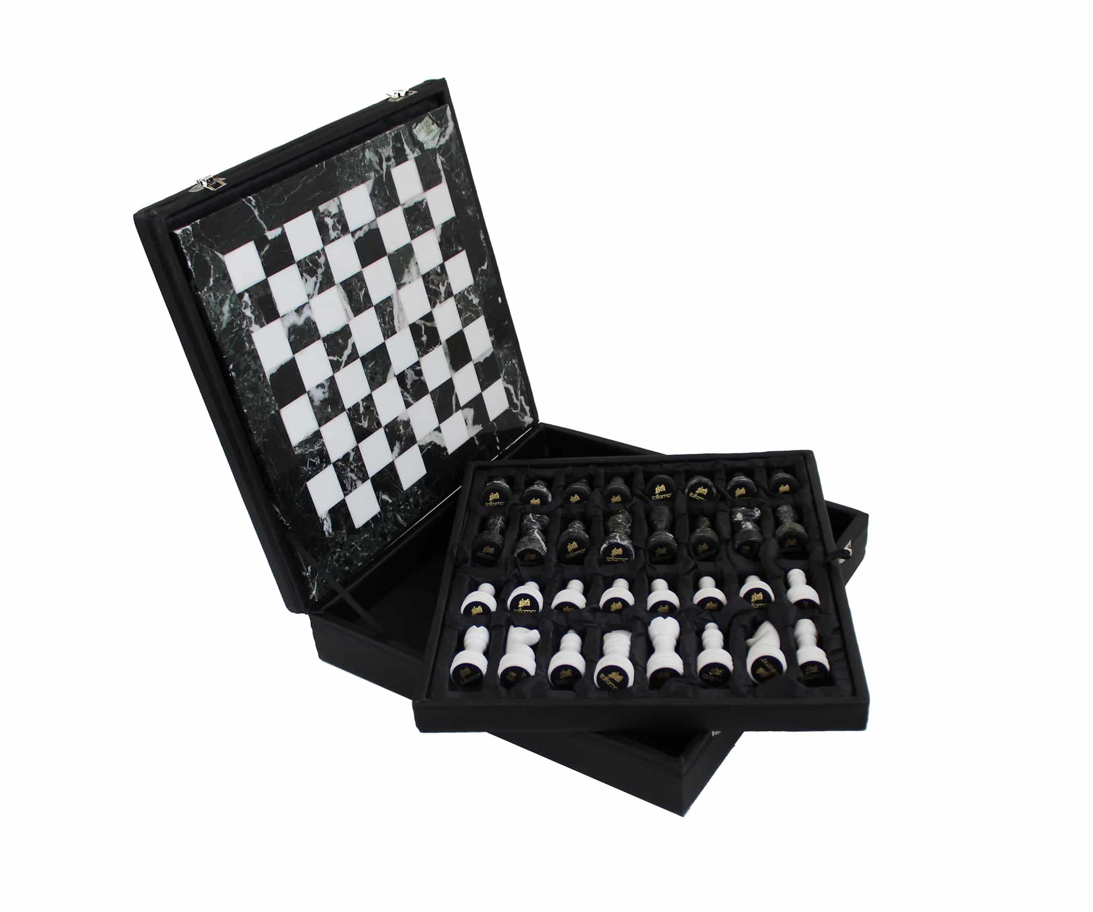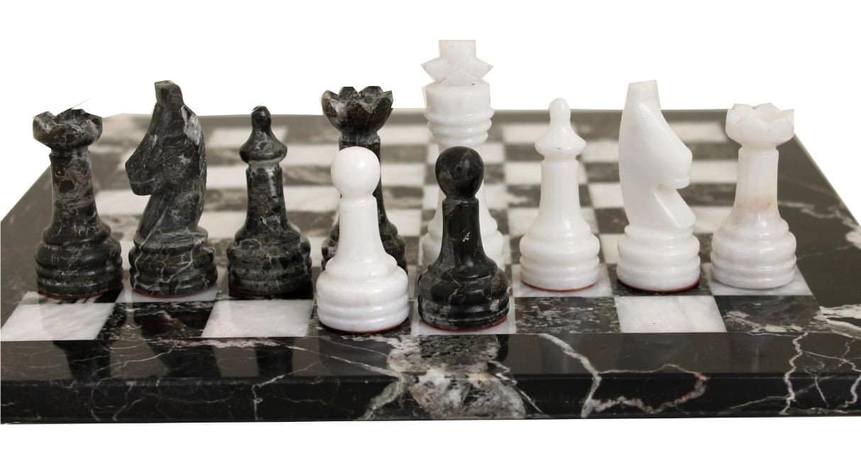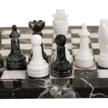 Un conjunto de juego de ajedrez realizado completamente en mármol, las piezas de ajedrez de estilo Staunton han sido talladas y pulidas a mano, en tonalidades negras y blancas.