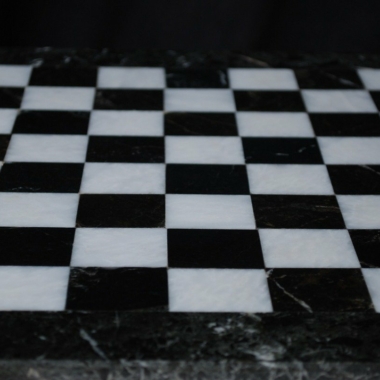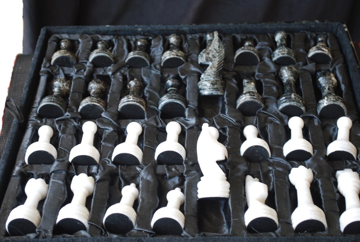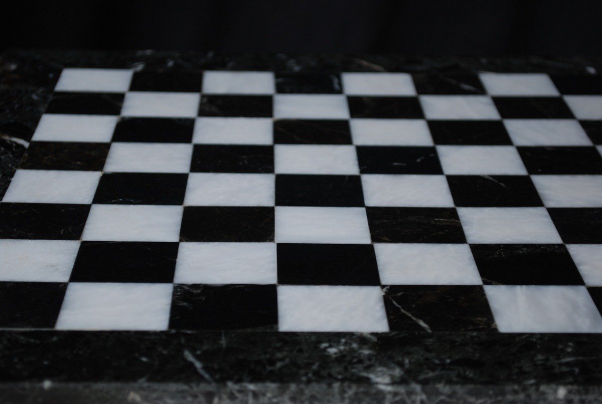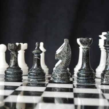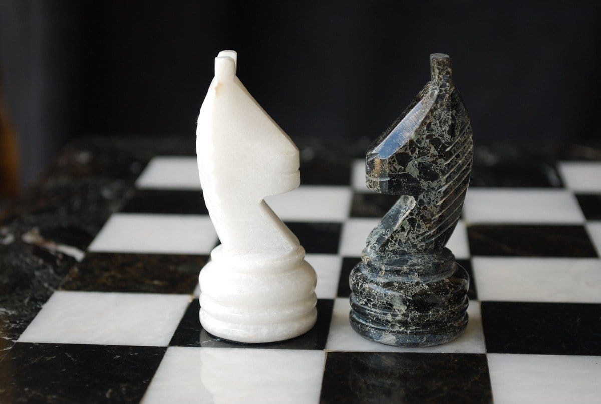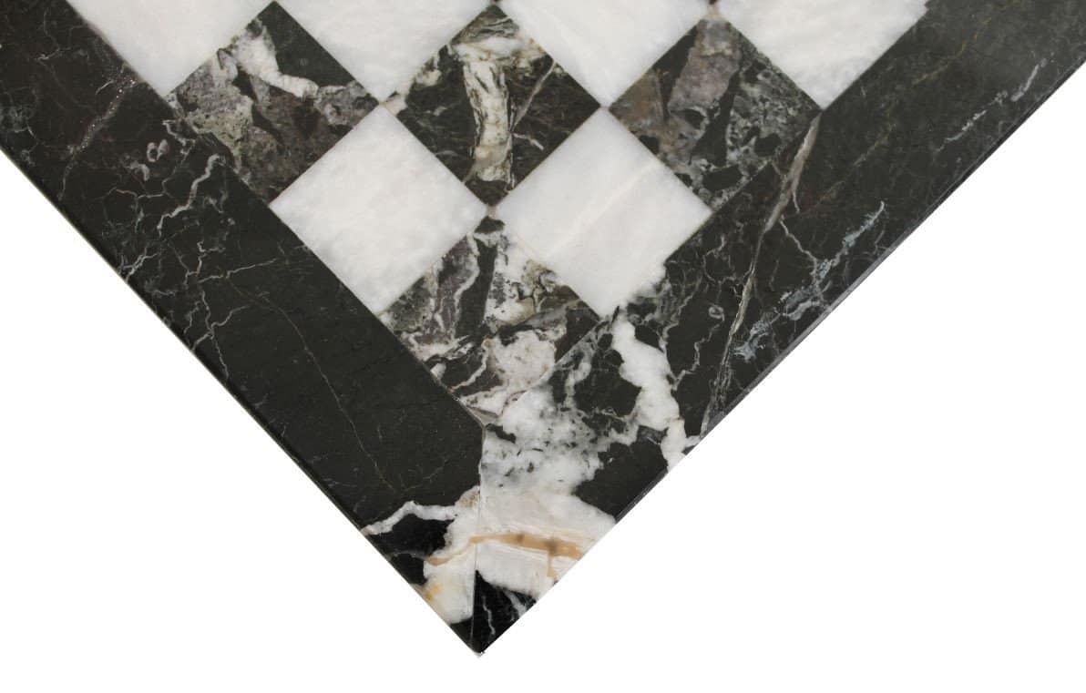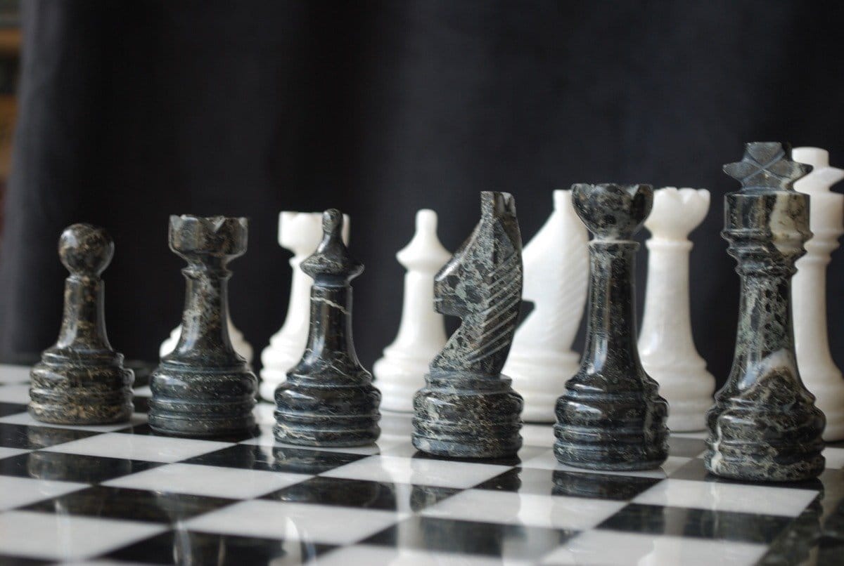Un conjunto de juego de ajedrez realizado completamente en mármol, las piezas de ajedrez de estilo Staunton han sido talladas y pulidas a mano, en tonalidades negras y blancas.