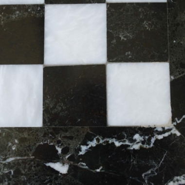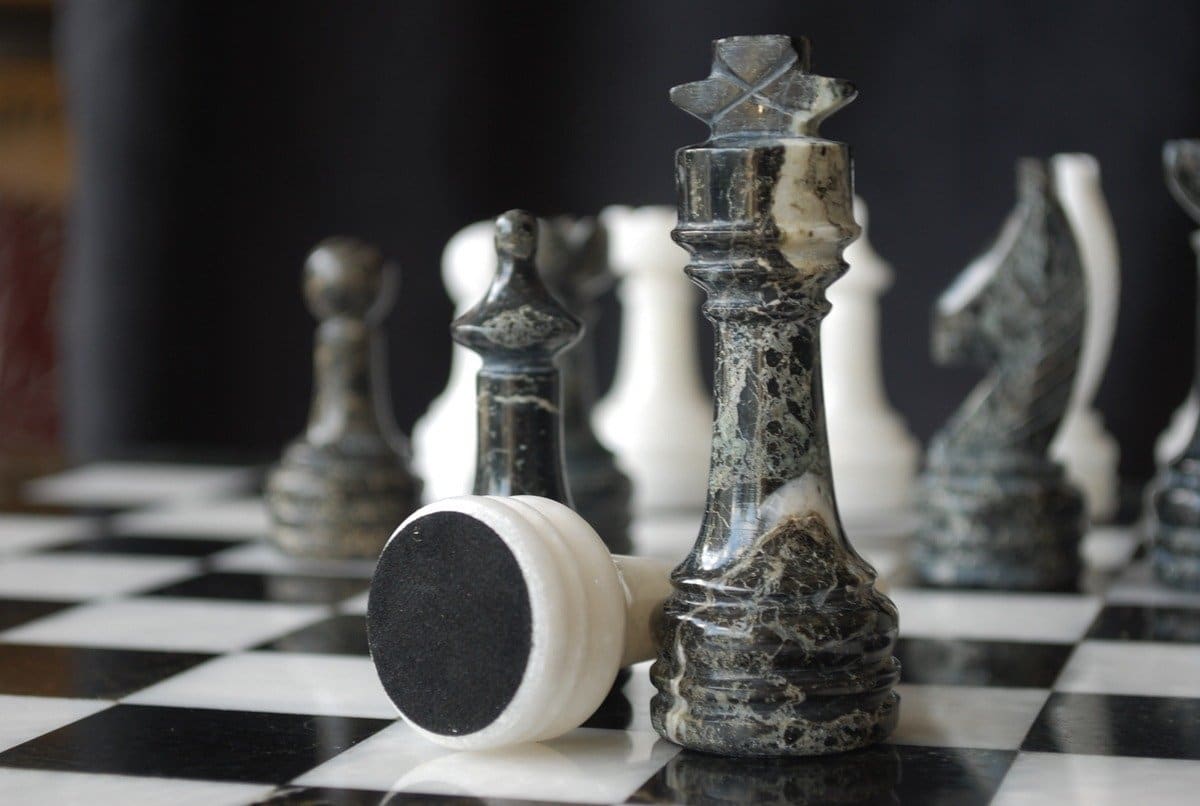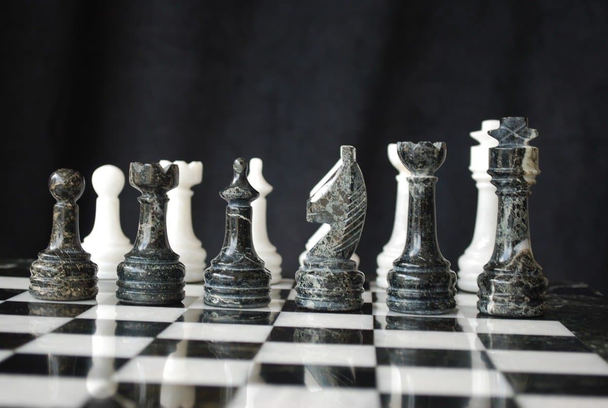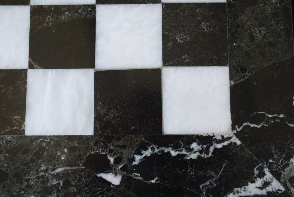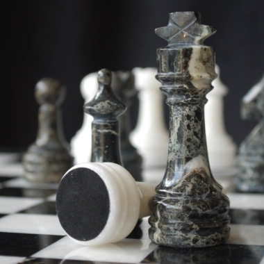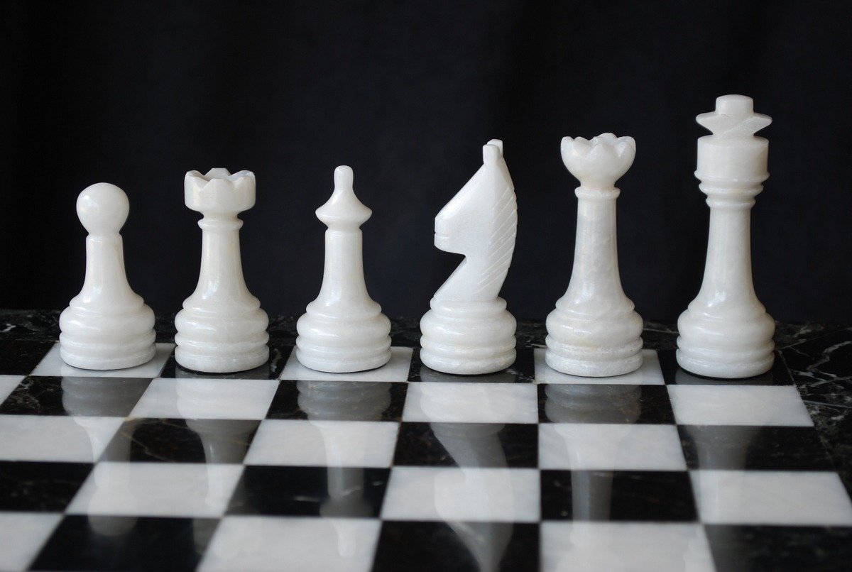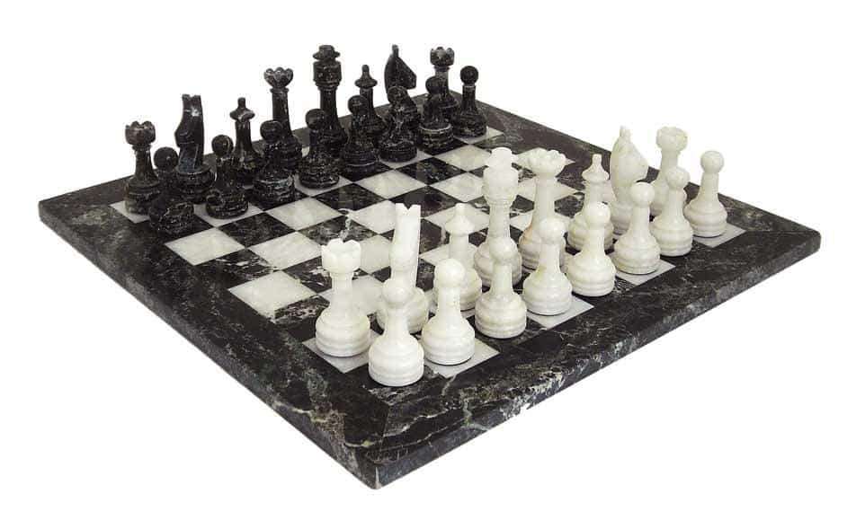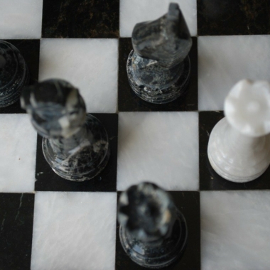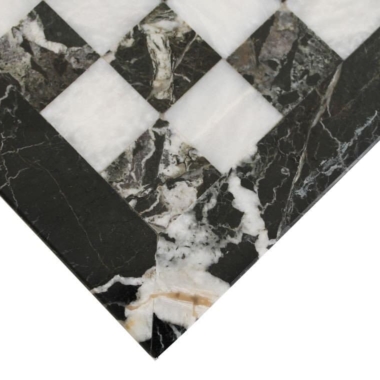 Un conjunto de juego de ajedrez realizado completamente en mármol, las piezas de ajedrez de estilo Staunton han sido talladas y pulidas a mano, en tonalidades negras y blancas.