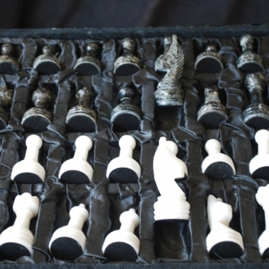Un conjunto de juego de ajedrez de pequeño tamaño y de bello diseño en estilo moderno.