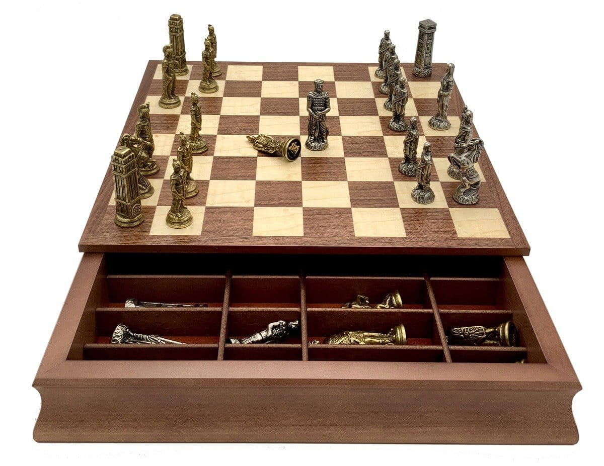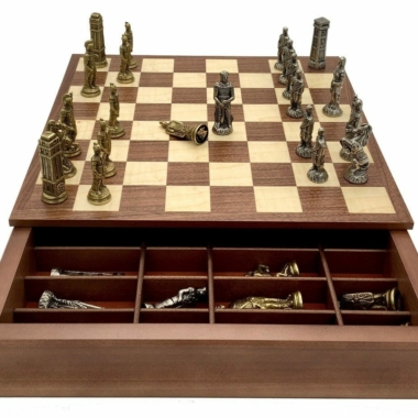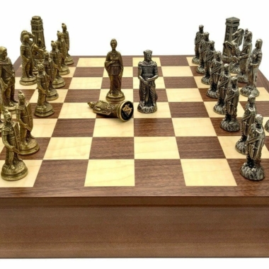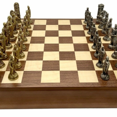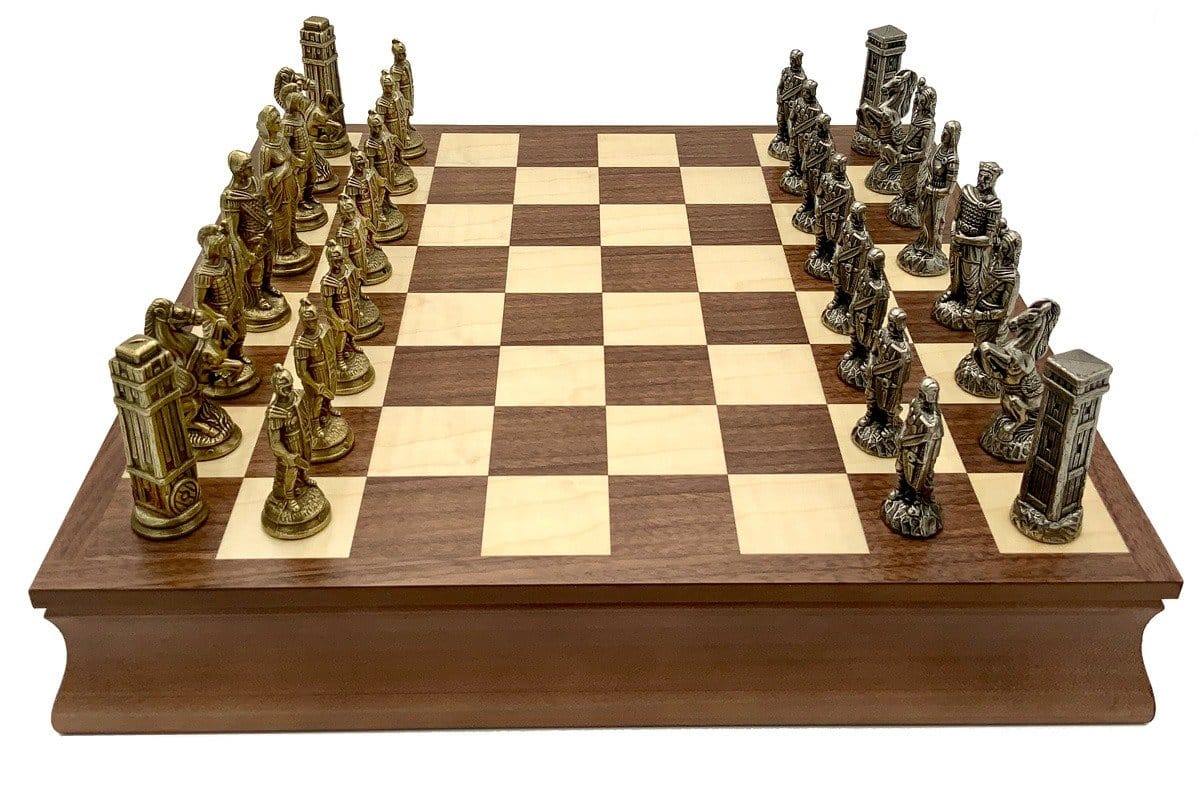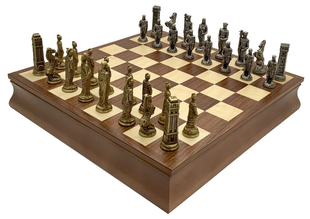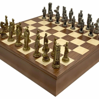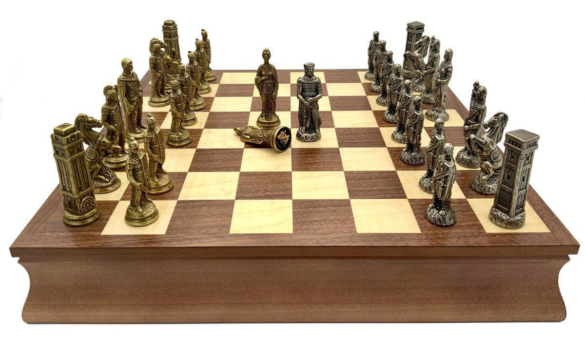 Las piezas de ajedrez están realizadas en metal, talladas y cinceladas a mano; muy elegantes, representan a las legiones romanas en su feroz lucha contra las tropas bárbaras.