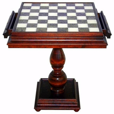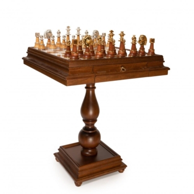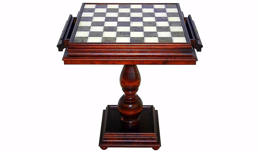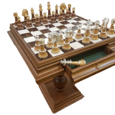 Se asocia al juego de ajedrez una mesa de ajedrez de alta gama, el tablero está realizado en madera maciza de haya, pero, lo que en realidad es un objeto de alta gama, es la realización del tablero de juego en mármol de Carrara y alabastro de Toscana.