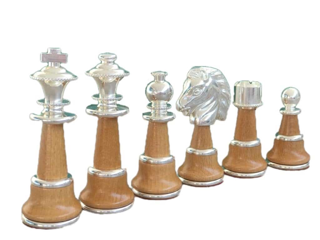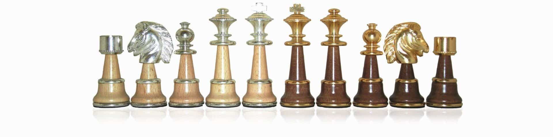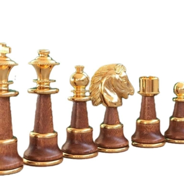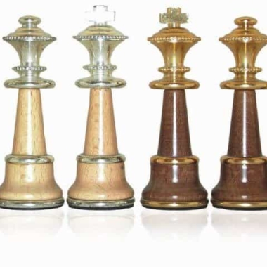 Juego de ajedrez de diseño tradicional pero de gran tamaño realizado en muy buenos materiales. Las piezas están talladas a mano combinando la madera y el latón macizo con un acabado en chapado de oro y plata. Los acabados son perfectos, realizados por artesanos confirmados. El chapado en oro y plata resalta los detalles elaborados por los artesanos y da un brillo al conjunto.