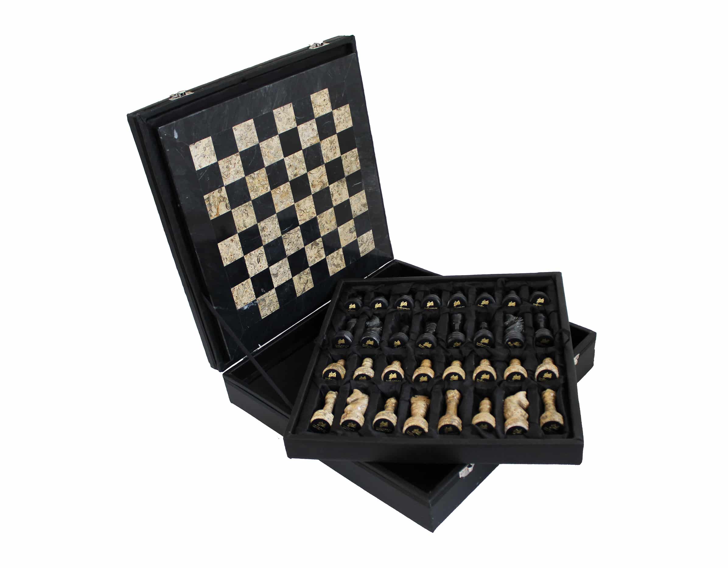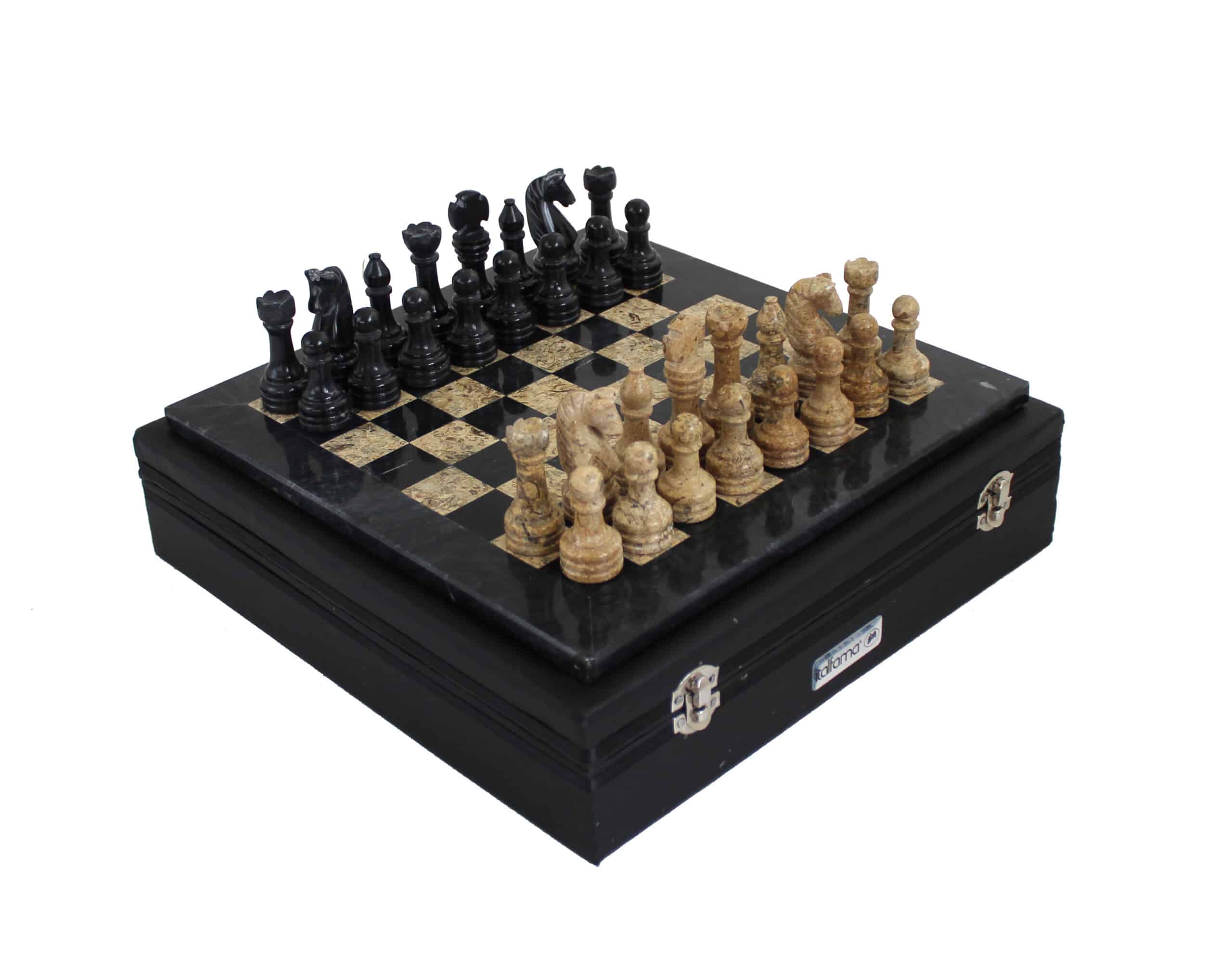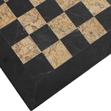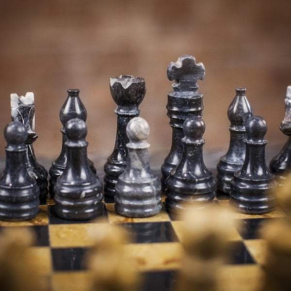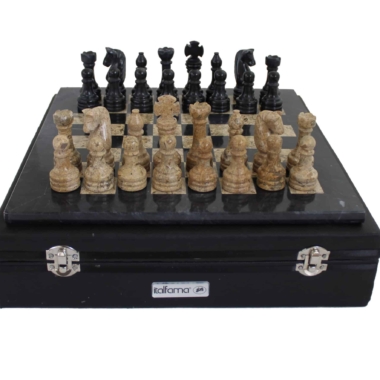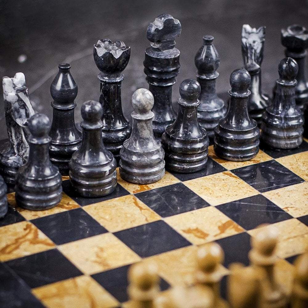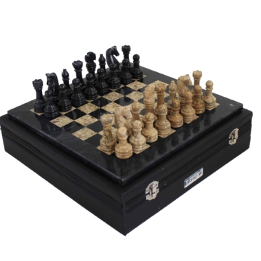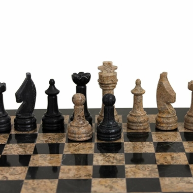 Un conjunto de juego de ajedrez realizado completamente en piedra natural y en mármol, las piezas de ajedrez de estilo Staunton han sido talladas y pulidas a mano, en tonalidades negras y beige oscuro.