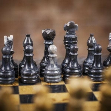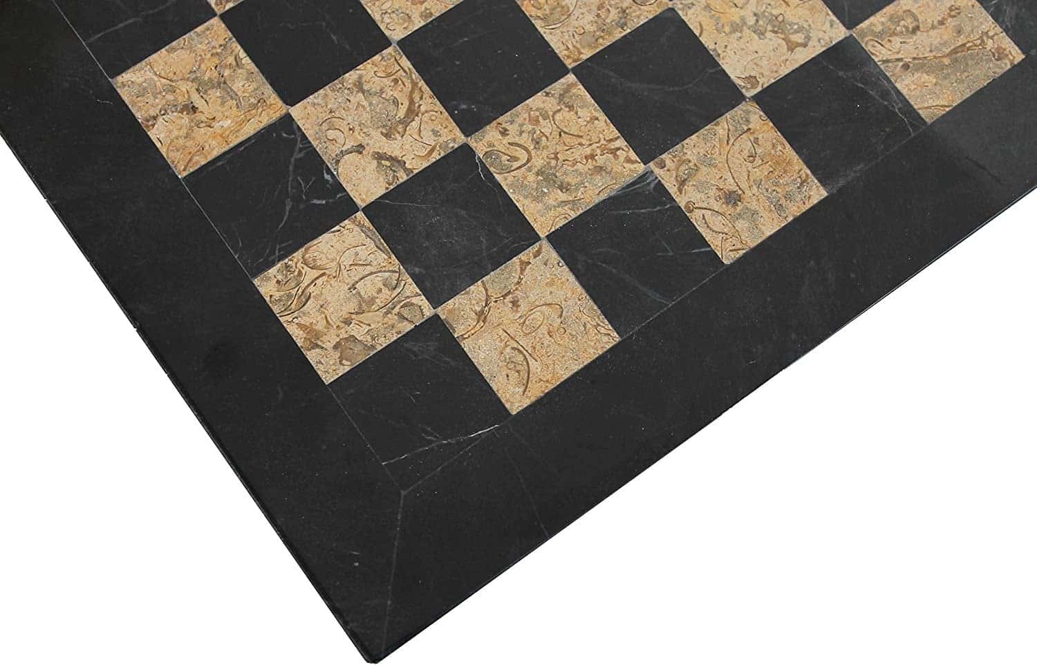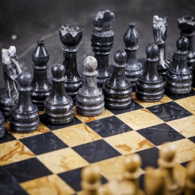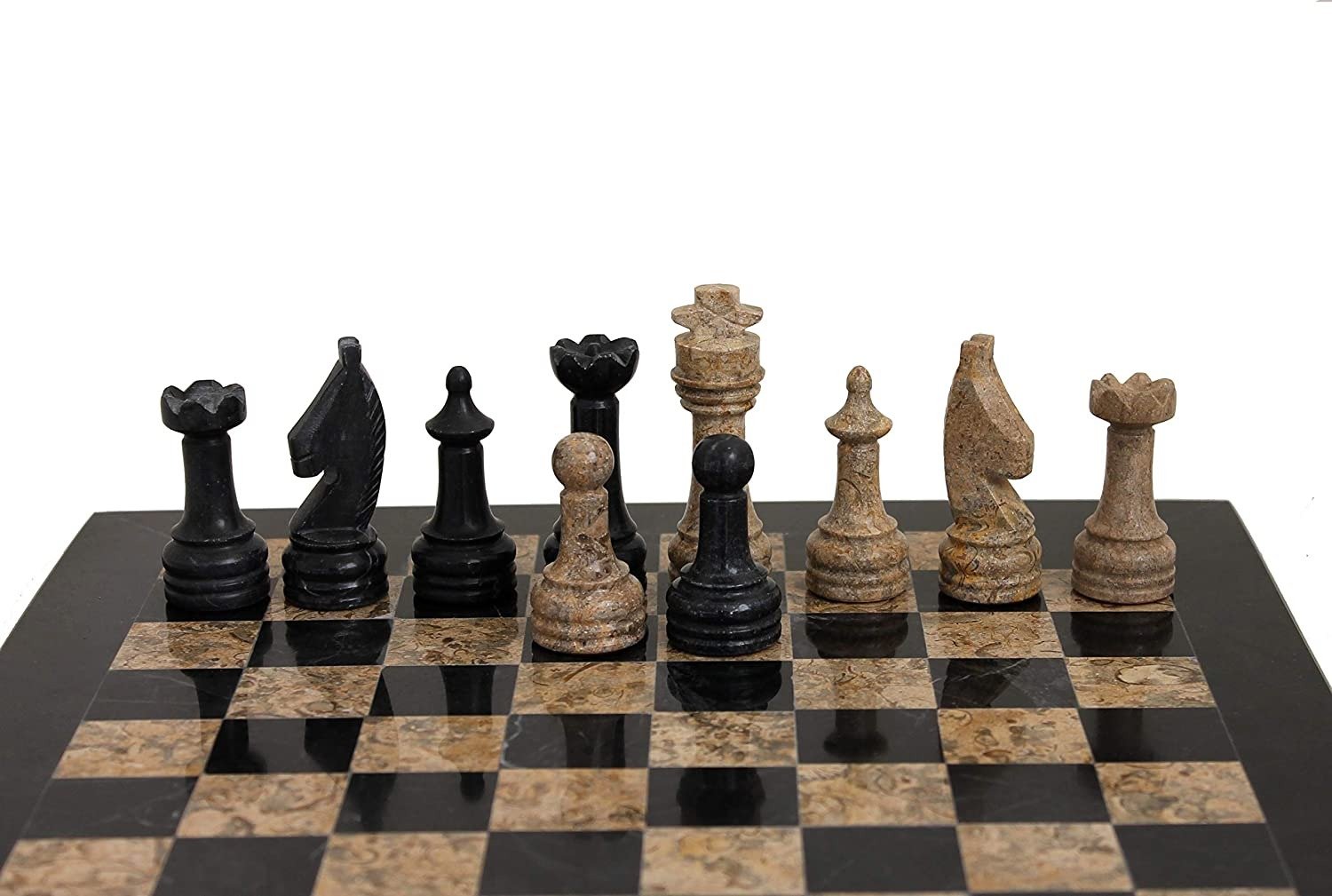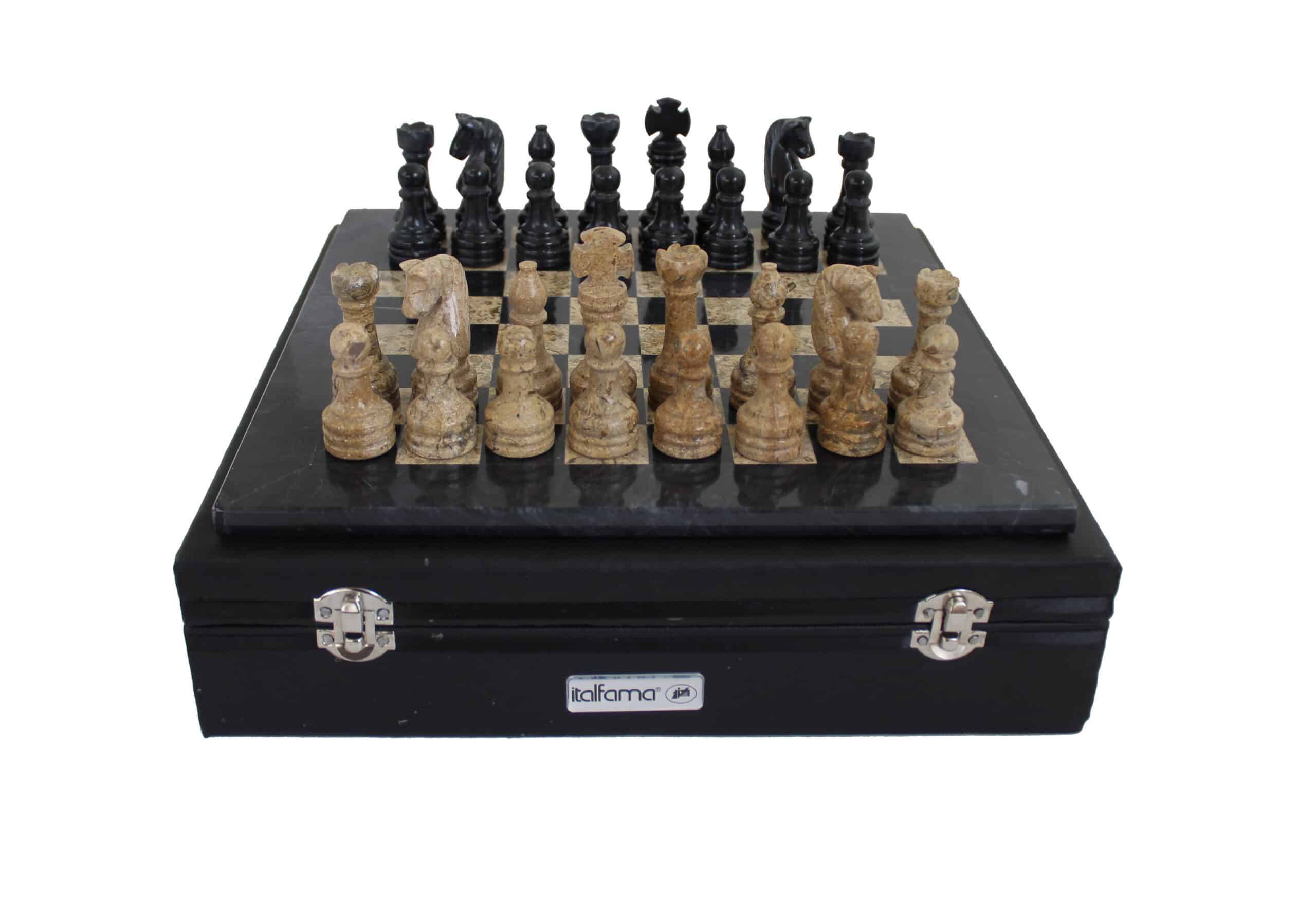 Un conjunto de juego de ajedrez realizado completamente en piedra natural y en mármol, las piezas de ajedrez de estilo Staunton han sido talladas y pulidas a mano, en tonalidades negras y beige oscuro.