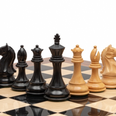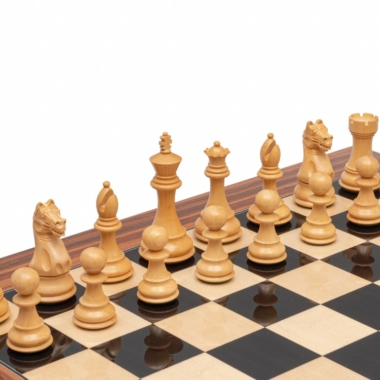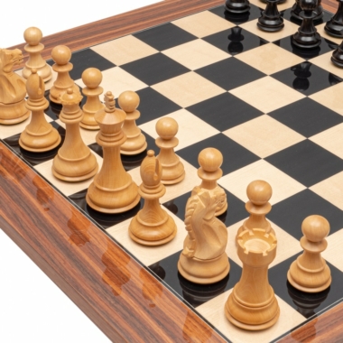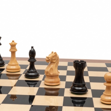 El tablero de ajedrez, de una dimensión de 55 x 55 cm, tiene una superficie de juego creada a partir de placados en madera de alta calidad, de anégre negro contrastando con los placados en arce más claro. El amplio borde alrededor de la superficie de juego es de palisandro, una madera de palisandro maravillosamente veteada, y todo el tablero cuenta con un acabado brillante.