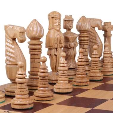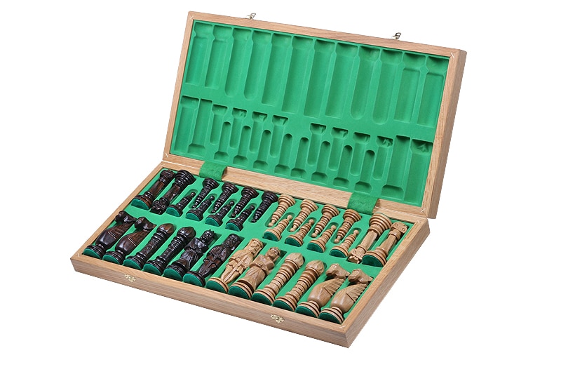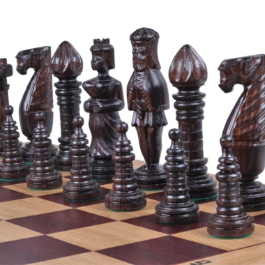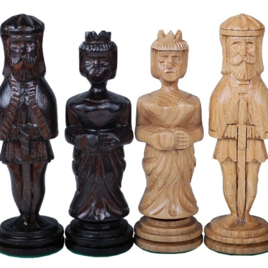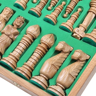 Es uno de los juegos de ajedrez más grandes e impresionantes de nuestra gama con una altura de rey de 15 cm. El diseño de las piezas de ajedrez es único y original. Estas piezas de ajedrez están completamente hechas a mano en madera de roble y son pesadas.