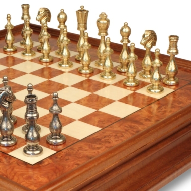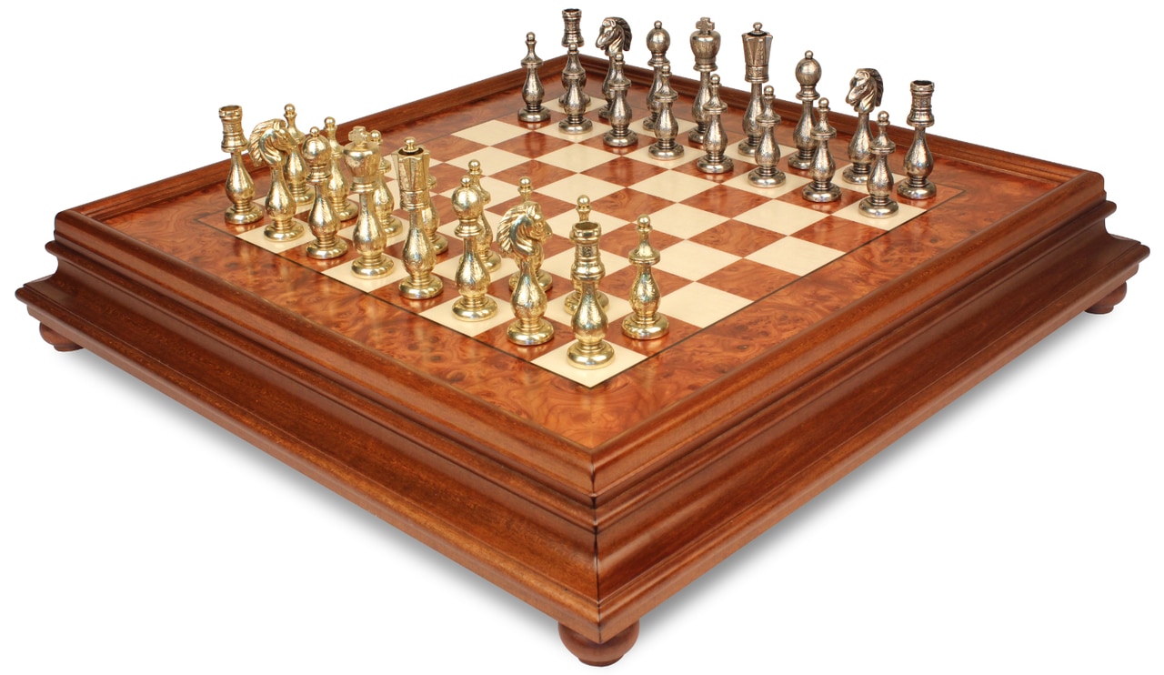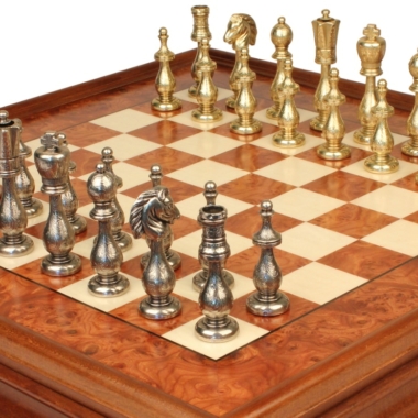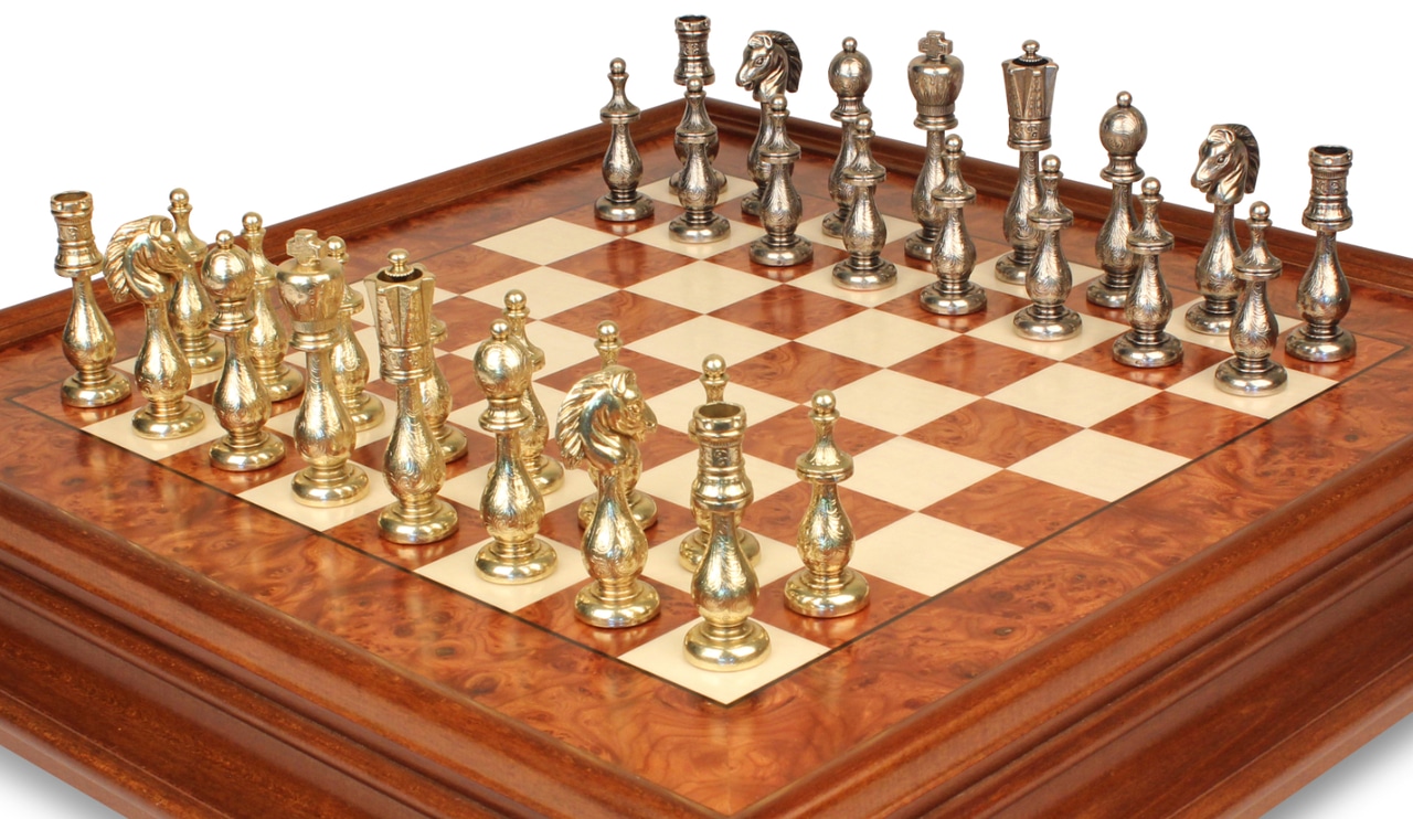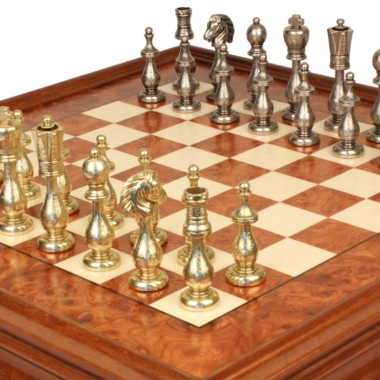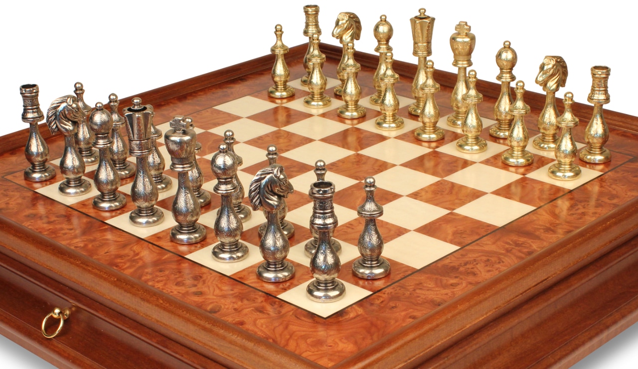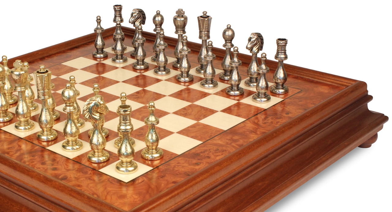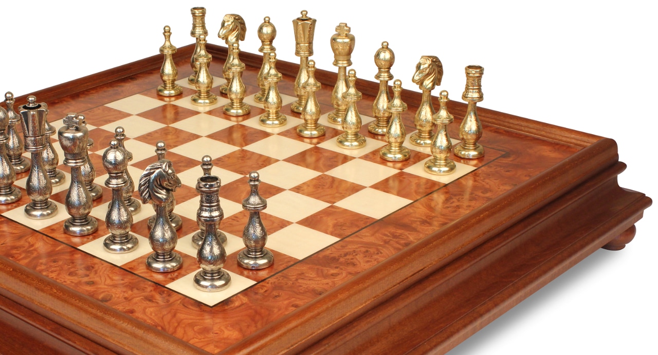 Juego de Ajedrez Arabesco – Tablero de Ajedrez de Madera de Brezo y Madera de Olmo con Cajón & Piezas de Metal