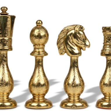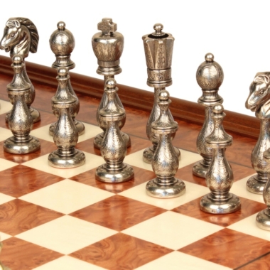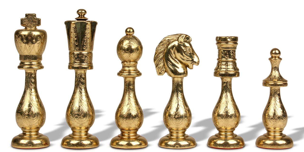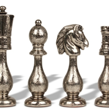 El juego de ajedrez Arabesco tiene una altura de rey de 10 cm y está fabricado en metal, presenta numerosos detalles pulidos y cincelados a mano.
