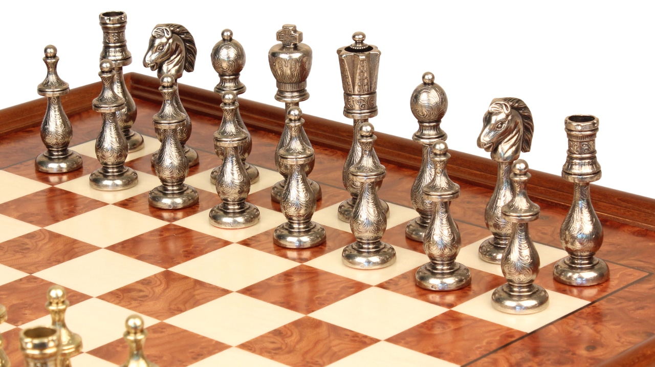 Un conjunto completo de juego de ajedrez de salón de alta gama con materiales de calidad y un acabado cuidado de realización italiana.