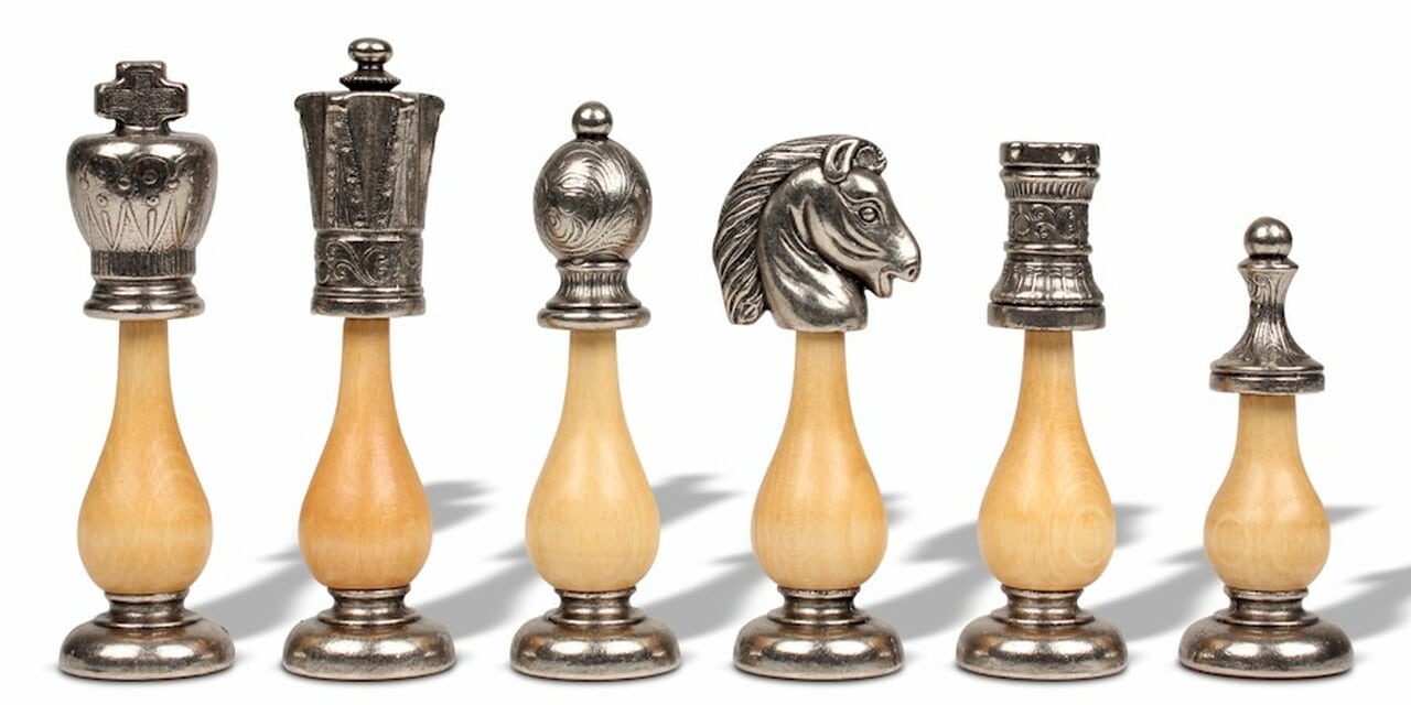 Las piezas de ajedrez Arabesco están fabricadas en madera y metal, completamente hechas a mano, tienen una altura de rey de 10 cm.