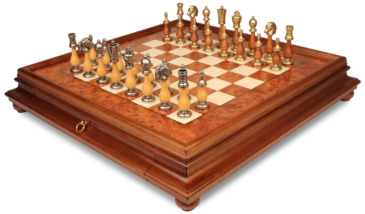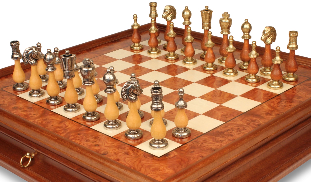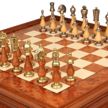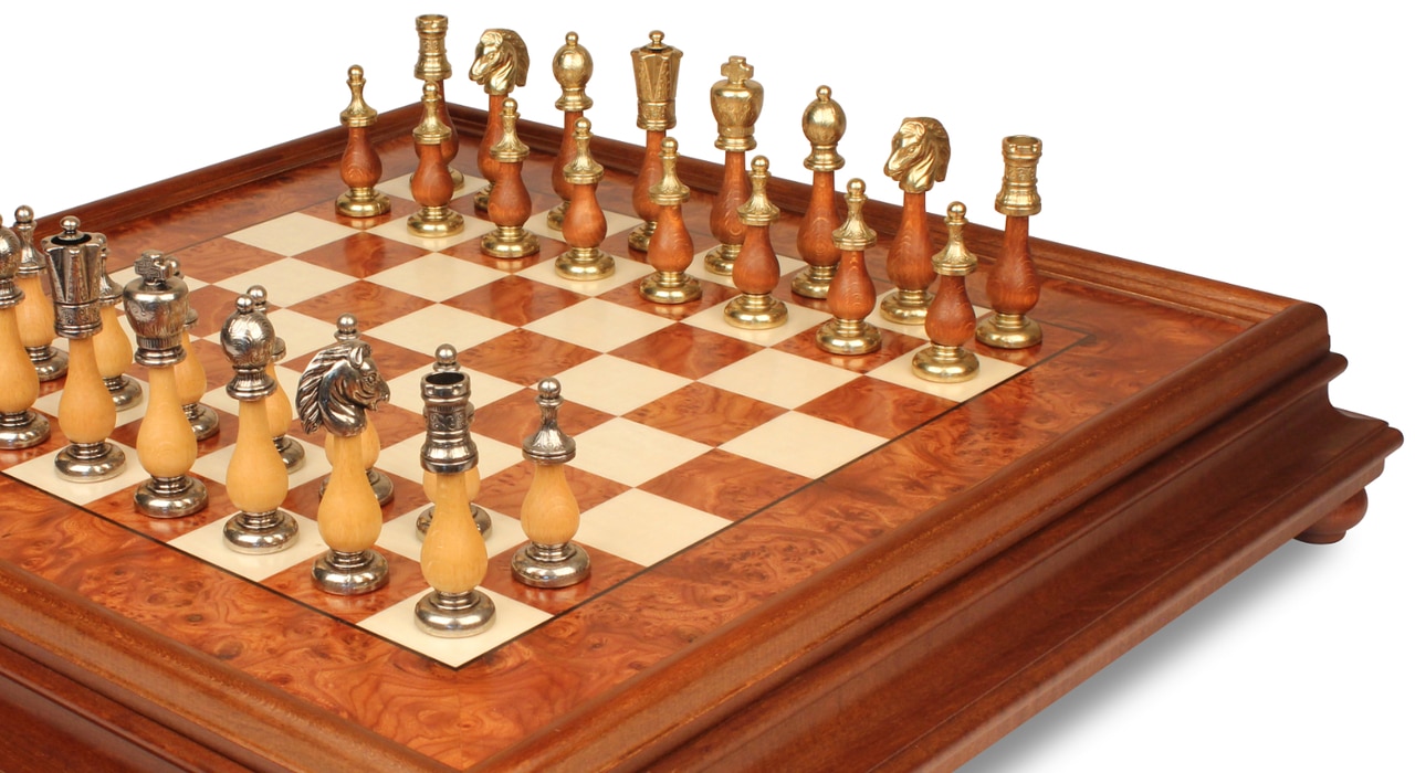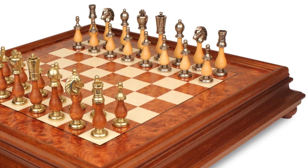 Juego de Ajedrez Arabesco – Tablero de Madera de Brezo y Madera de Olmo con Cajón & Piezas de Metal y Madera