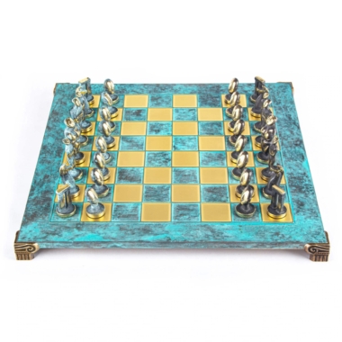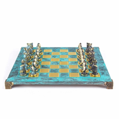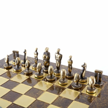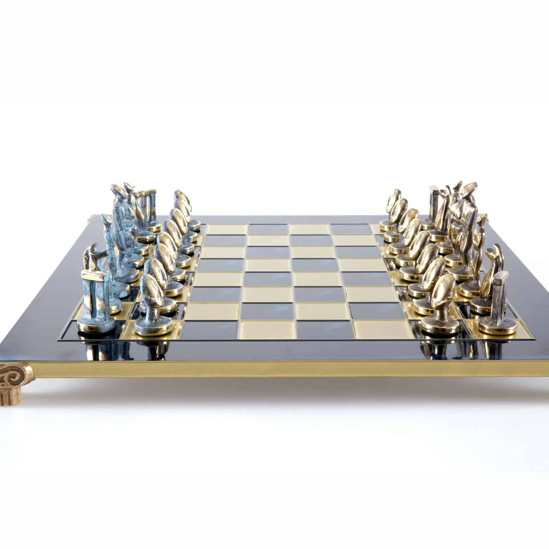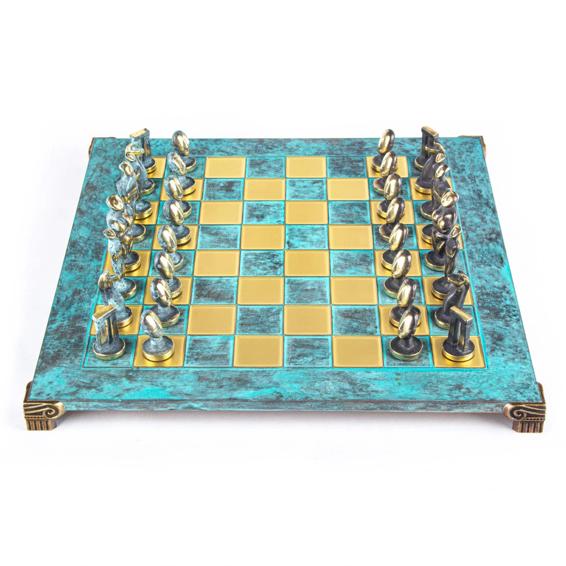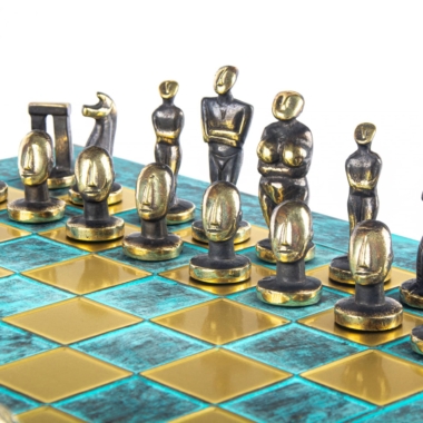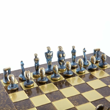 Juego de Ajedrez Arte Cicládico en Latón Macizo – Piezas Azules y Marrones