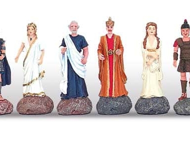 Las piezas de ajedrez están realizadas con el tema de la Batalla de Troya. Totalmente esculpidas y pintadas a mano, sus realizaciones artesanales las convierten en verdaderos personajes vivos. Con una altura de rey de 7,5 cm son agradables de manipular.