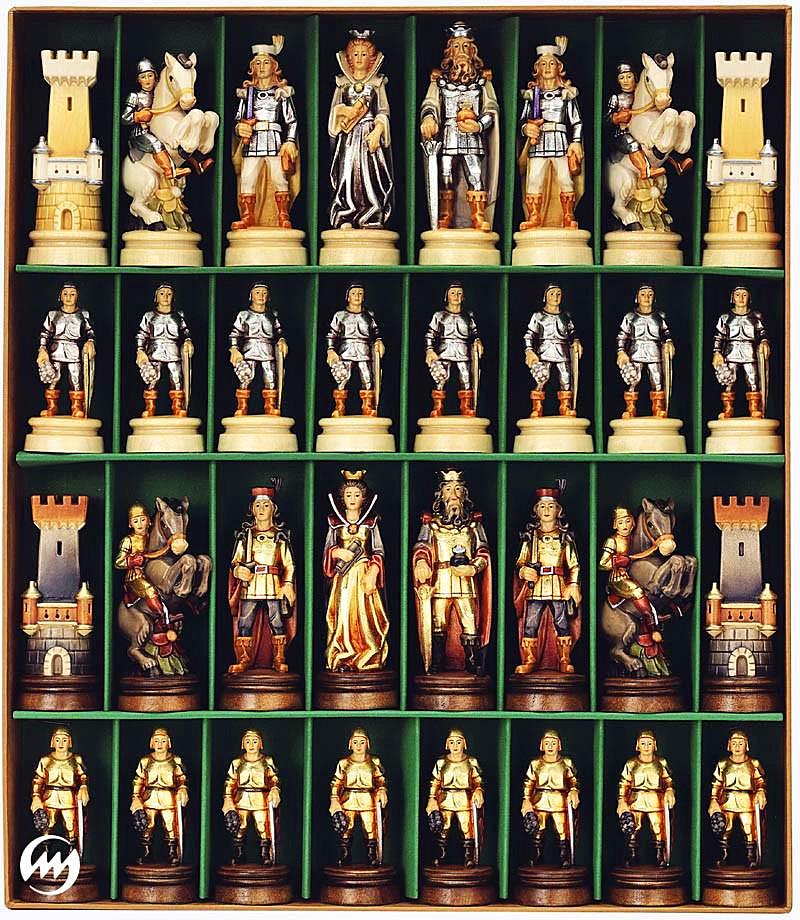 Un conjunto de piezas de ajedrez de coleccionista, realizado por artistas expertos de las escuelas de arte de Ortisei y Selva Gardena.