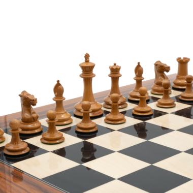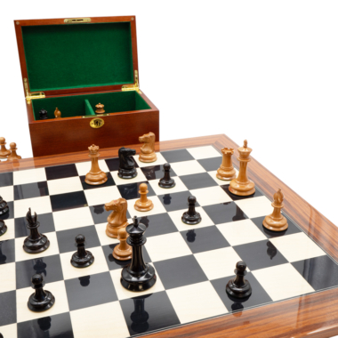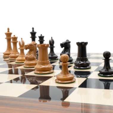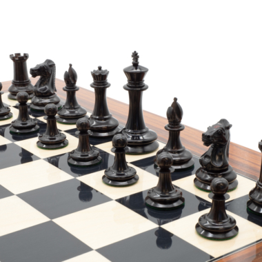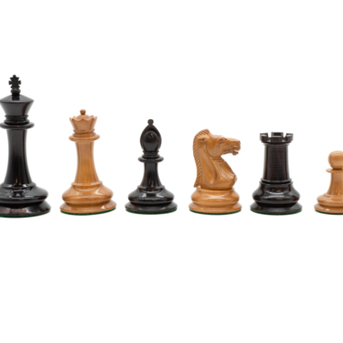 Las piezas de ajedrez están completamente hechas a mano en madera de ébano para las piezas negras y en madera de boj para el otro conjunto de piezas. Tienen una altura de rey de 8,9 cm.