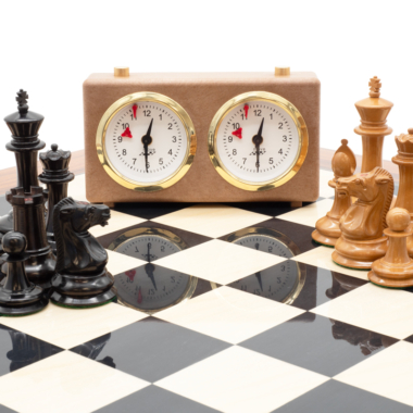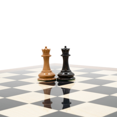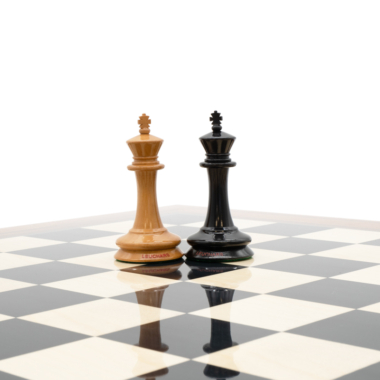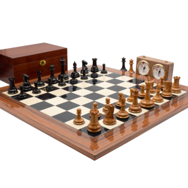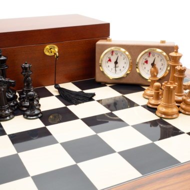 Están acompañadas de un hermoso tablero de ajedrez con acabado ultra brillante y fabricado a partir de madera de anegre negro, arce y palisandro. Se combina perfectamente con las piezas de ajedrez de ébano. De gran tamaño, mide 55 x 55 cm.
