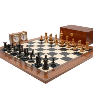 Las piezas de ajedrez están completamente hechas a mano en madera de ébano para las piezas negras y en madera de boj para el otro conjunto de piezas. Tienen una altura de rey de 8,9 cm.