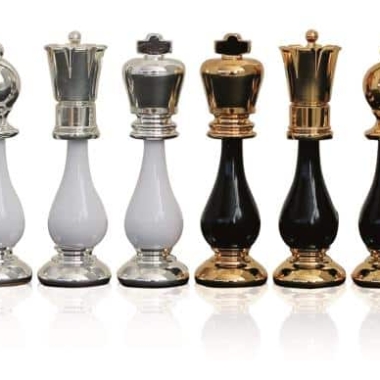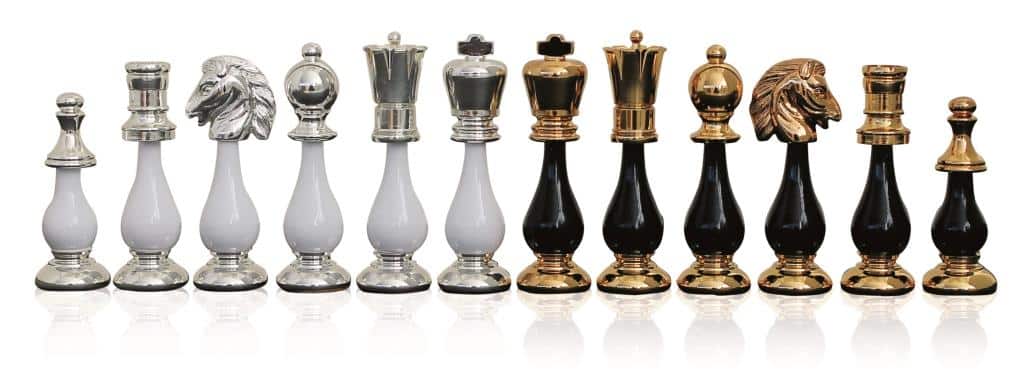 Las piezas de ajedrez son una obra de arte por sí solas. Modeladas a mano combinando latón y madera han requerido largas horas de trabajo. La madera ha sido trabajada en tonos negros y blancos y el metal chapado en oro y plata. Con una altura de rey de 9,9 cm están perfectamente equilibradas para un verdadero placer de juego.