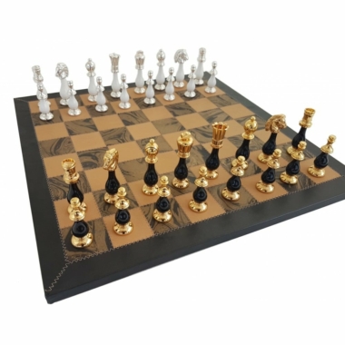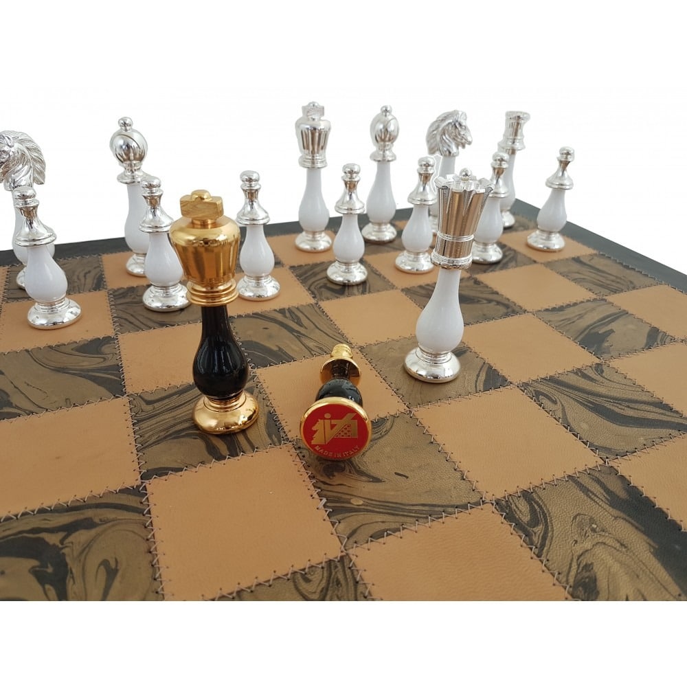 Juego de Ajedrez de Lujo Negro y Blanco de Latón y Madera y Tablero de Ajedrez en Cuero Verdadero Italiano