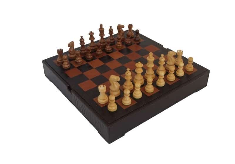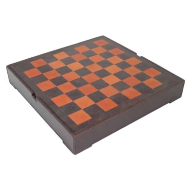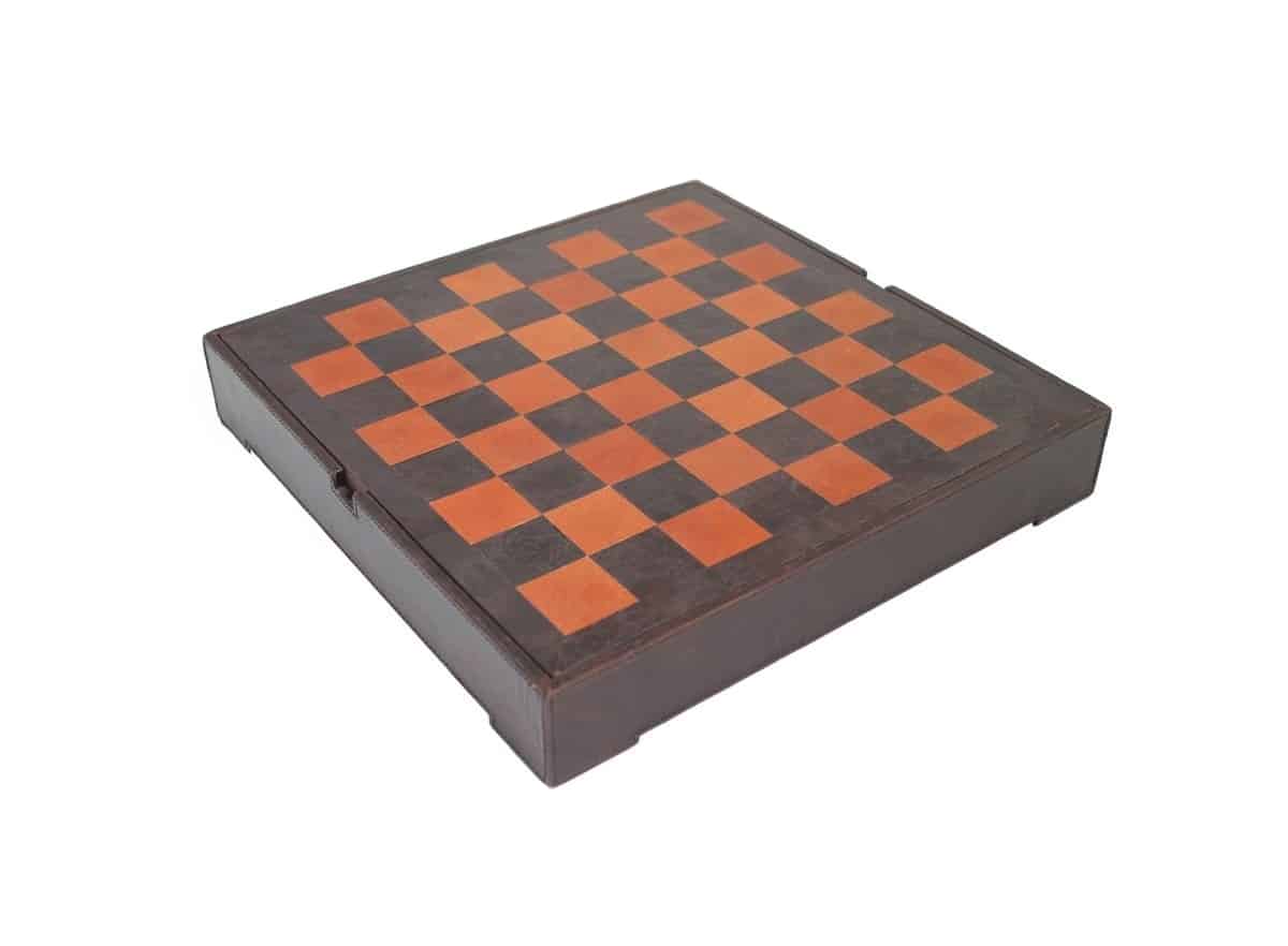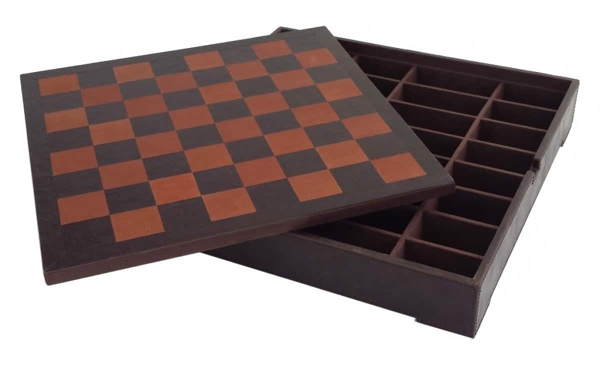 Un conjunto de juego de ajedrez de diseño y original compuesto por un tablero de cuero verdadero de 35 x 35 cm que cuenta bajo el tablero de juego con un compartimento de almacenamiento individual para cada pieza.
