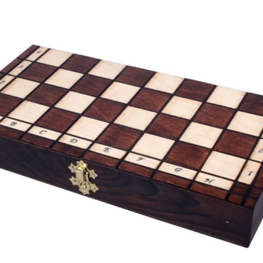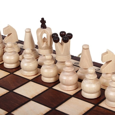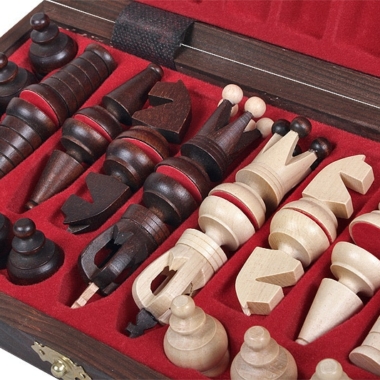 Las bonitas piezas de ajedrez , con una altura de rey de 6,5 cm, están fabricadas en madera de tilo y haya. El tablero plegable cuenta con un espacio para el almacenamiento de las piezas de ajedrez en su interior.