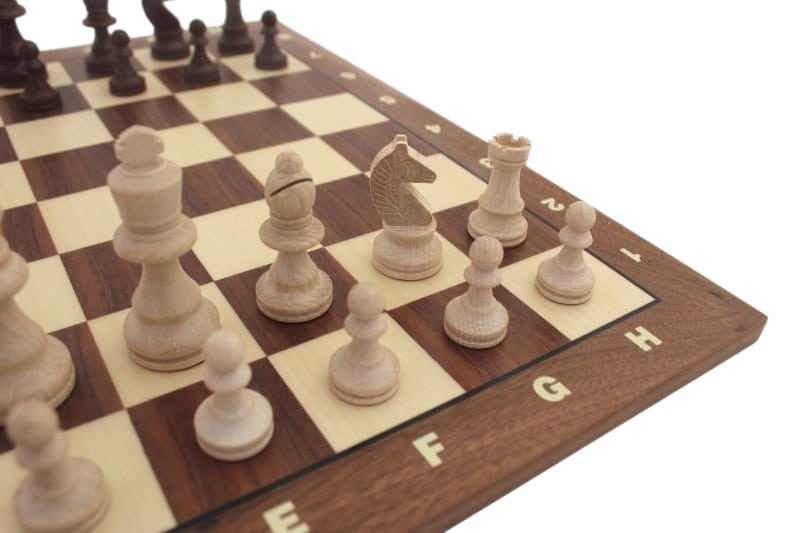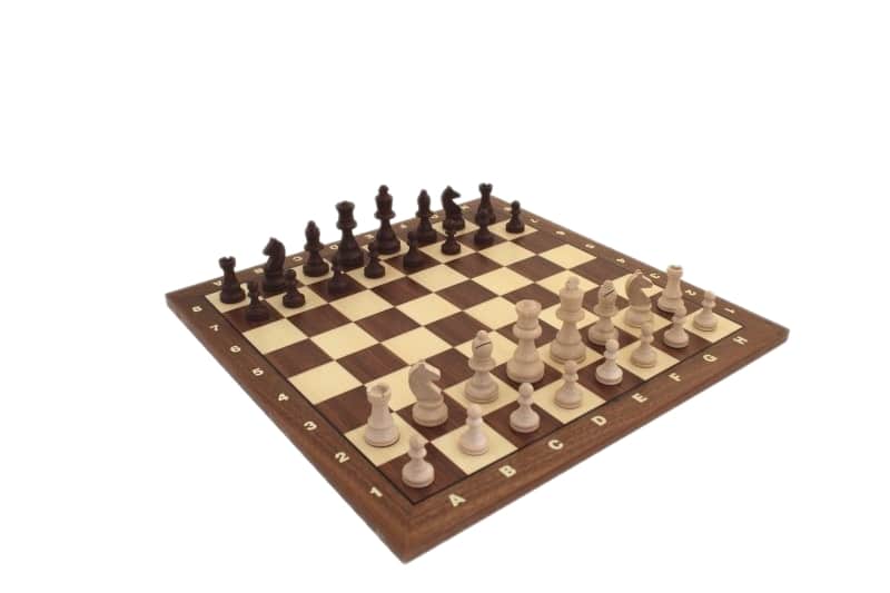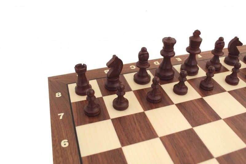 Un conjunto de juego de ajedrez de madera de tamaño clásico.