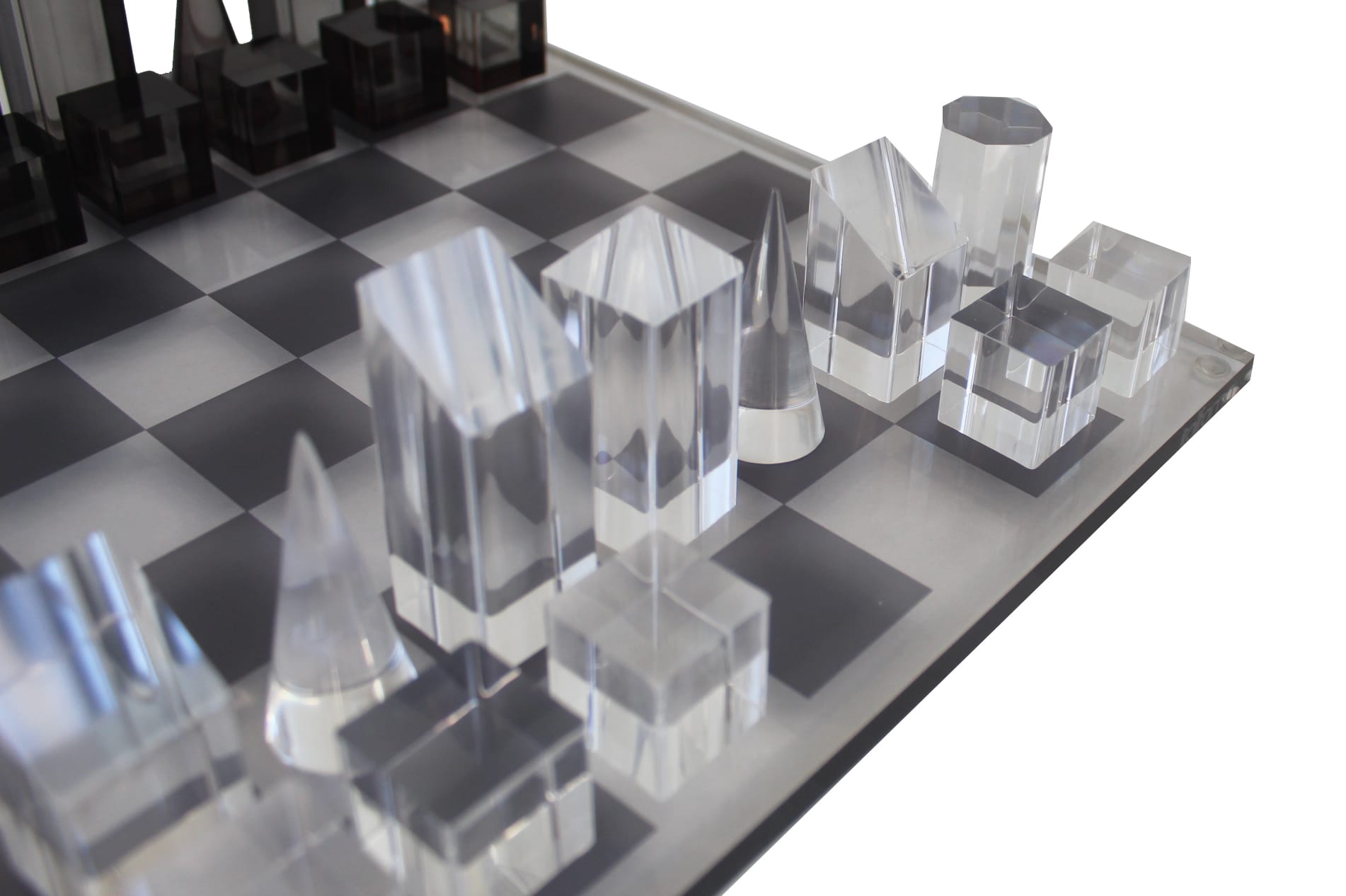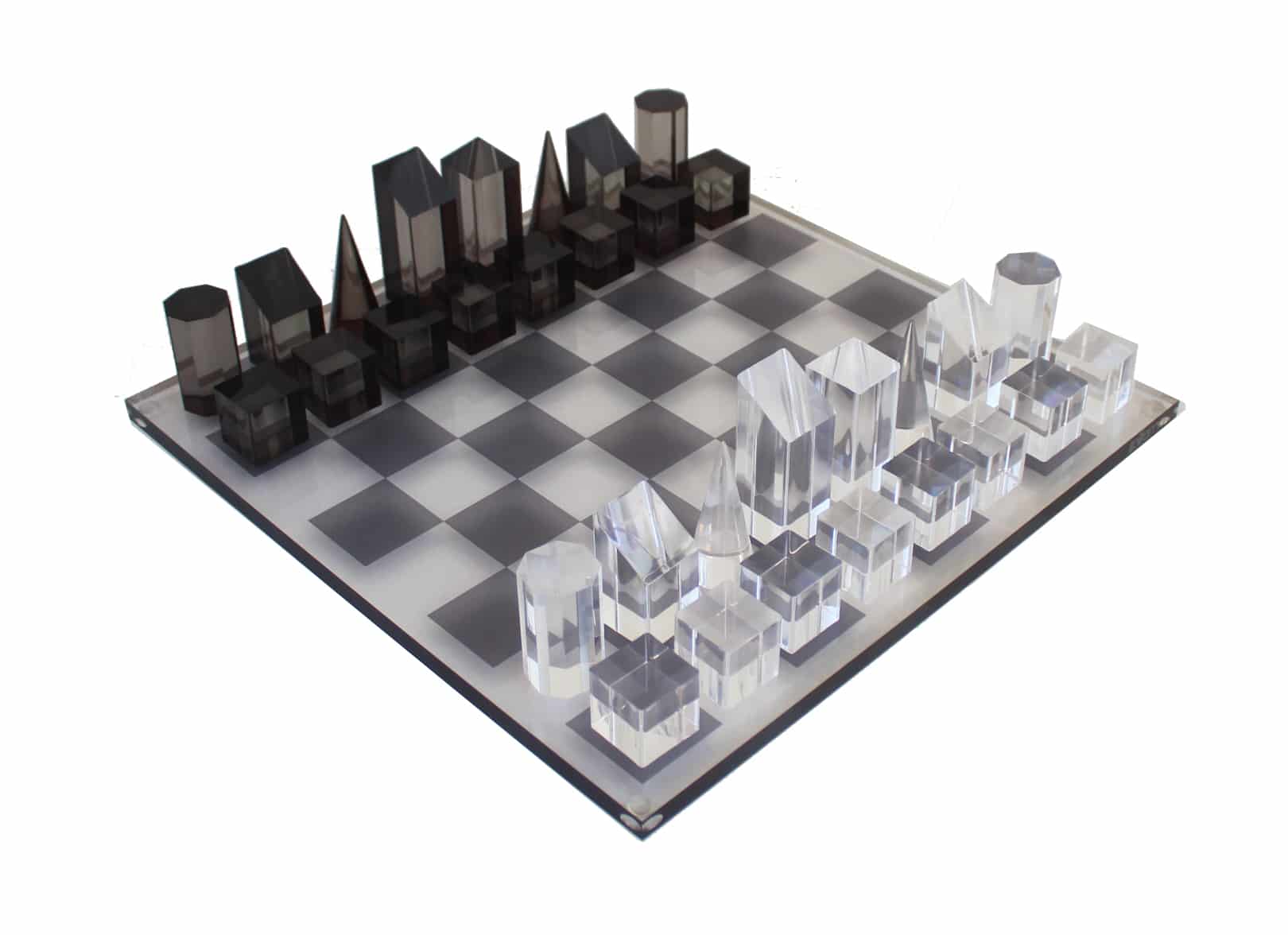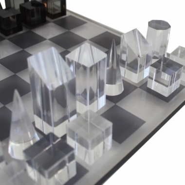 Un conjunto de juego de ajedrez cúbico original completamente realizado en plexiglás.